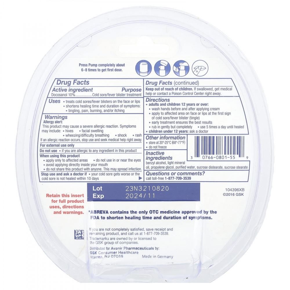 ABREVA содержит единственное безрецептурное лекарство, одобренное FDA для сокращения времени заживления и продолжительности симптомов.