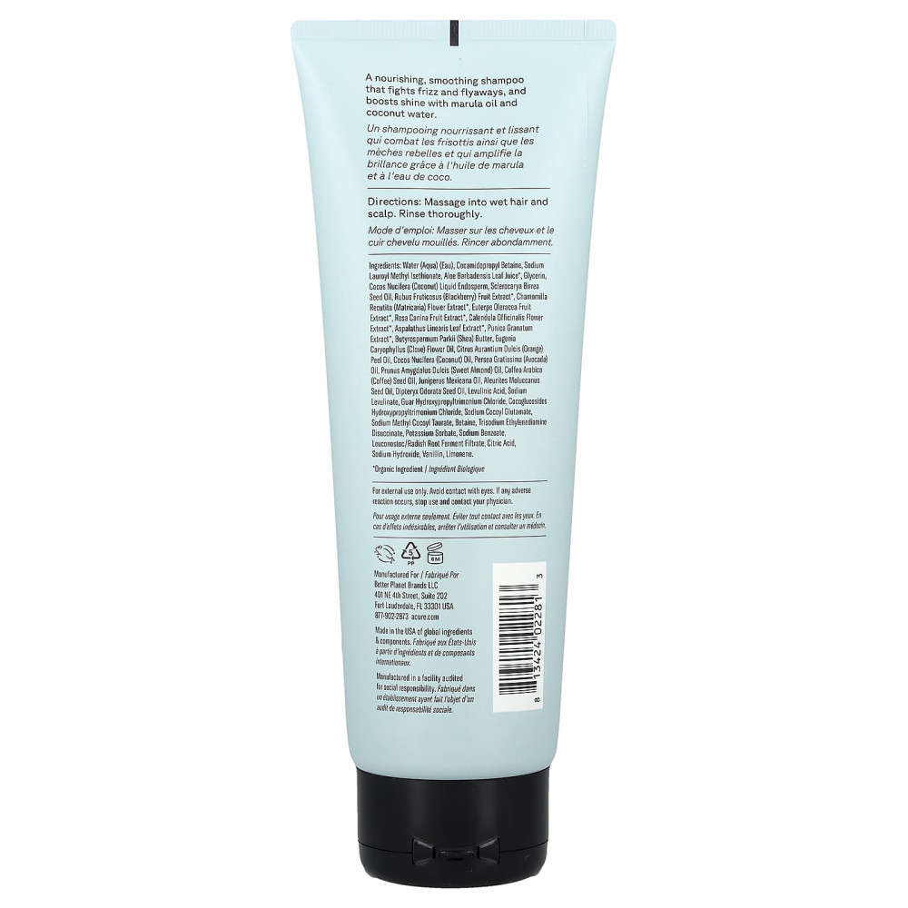 Питательный, разглаживающий шампунь, который борется с пушением и непослушными волосами, а также усиливает блеск благодаря маслу марулы и кокосовой воде.