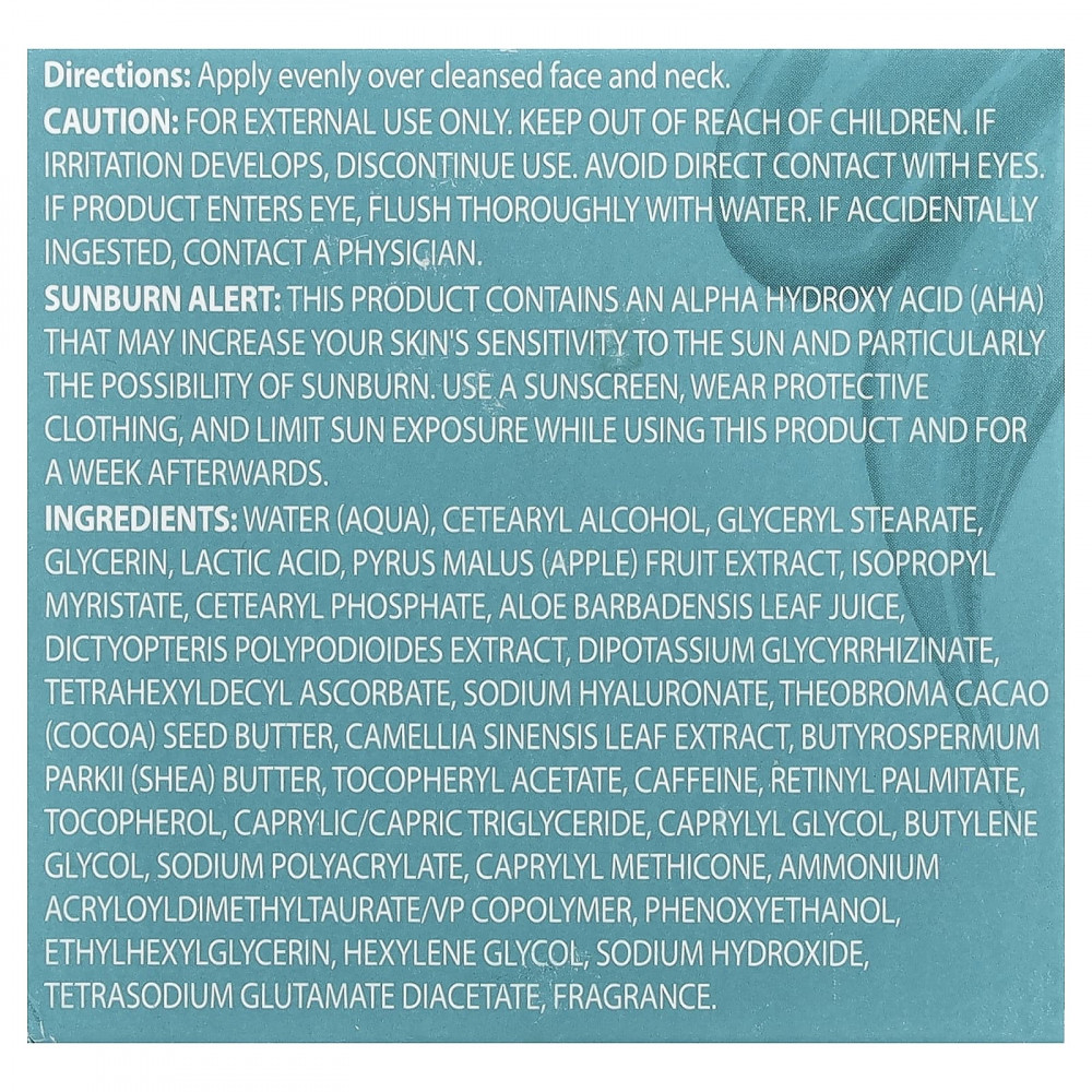 Вода, Цетеариловый спирт, глицерил стеарат, глицерин, молочной кислоты, экстракт яблока (Pyrus malus), изопропил миристат, цетеарил фосфат, сок листьев алоэ вера (Aloe barbadensis), экстракт готу колы (Dictyopteris Polypodioides), дикалия глицирризинат, тетрагексилдецил аскорбат, гиалуронат натрия, масло зерен какао (Theobroma cacao), Экстракт листьев камелии китайской, Масло Butyrospermum parkii (Ши), токоферилацетат, кофеин, ретинилпальмитат, Токоферол, каприловый/каприновый триглицерид, каприлилгликоль, бутиленгликоль, полиакрилат натрия, каприлилметикон, аммоний акрилоилдиметилтаурат/ВП сополимер, феноксиэтанол, этилгексилглицерин, гексиленгликоль, гидроксид натрия, диацетат глутамата тетранатрия, аромат.
