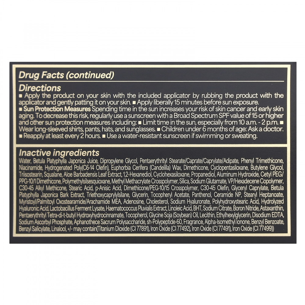 Вода, сок Betula platyphylla japonica, дипропиленгликоль, пентаэритритил стеарат / капрат / каприлат / адипат, фенилтриметикон, никотинамид, гидрогенизированный поли (С6-14 олефин), канделильский воск, диметикон, циклопентасиленгликоль, диметикон, циклопентасиленгликоль , экстракт листьев алоэ барбаденсис, 1,2-гександиол, циклогексасилоксан, пропандиол, гидроксид алюминия, цетил ПЭГ / ППГ-10/1 диметикон, полиметилсилсесквиоксан, метилметакрилат кроссполимер, диоксид кремния, натрия глутамат, вполимер / гексадецен сополимер , стеариновая кислота, пара-анисовая кислота, кроссполимер диметикон / ПЭГ-10/15, олефин c30-45, глицерил каприлат, экстракт коры бетулы платифиллы японской, триэтоксикаприлилсилан, глицерин, токоферилацетат, пантенол, церамидгептано / нп, пальмитоид нп, стеарилгептаноат оксостеарамид / арахамид, аденозин, холестерин, гиалуронат натрия, полигидроксистеариновая кислота, гидролизованная гиалуроновая кислота, ферментный лизат лактобактерий, гематококк плювиальный экстракт s, линолевая кислота, БГТ, цитрат натрия, нитрид бора, астаксантин, пентаэритритил тетра-ди-трет-бутил гидроксигидроциннамат, токоферол, соевое масло (глицин соя), лецитин, этилгексилглицерин, динатриевая соль эдтацеи, аскорбилфосфат натрия, sh-полипептид-60, отдушка, альфа-изометилионон, бензилбензоат, бензил салицилат, линалоол, +/- может содержать (диоксид титана (CI 77891), оксид железа (CI 77492), оксид железа (CI 77491), оксид железа (CI 77499).