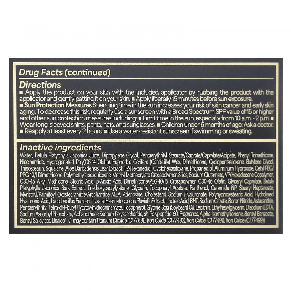 Вода, сок Betula platyphylla japonica, дипропиленгликоль, пентаэритритил стеарат / капрат / каприлат / адипат, фенилтриметикон, никотинамид, гидрогенизированный поли (С6-14 олефин), канделильский воск, диметикон, циклопентасиленгликоль, диметикон, циклопентасиленгликоль , экстракт листьев алоэ барбаденсис, 1,2-гександиол, циклогексасилоксан, пропандиол, гидроксид алюминия, цетил ПЭГ / ППГ-10/1 диметикон, полиметилсилсесквиоксан, метилметакрилат кроссполимер, диоксид кремния, натрия глутамат, вполимер / гексадецен сополимер , стеариновая кислота, пара-анисовая кислота, кроссполимер диметикон / ПЭГ-10/15, олефин c30-45, глицерил каприлат, экстракт коры бетулы платифиллы японской, триэтоксикаприлилсилан, глицерин, токоферилацетат, пантенол, церамидгептано / нп, пальмитоид нп, стеарилгептаноат оксостеарамид / арахамид, аденозин, холестерин, гиалуронат натрия, полигидроксистеариновая кислота, гидролизованная гиалуроновая кислота, ферментный лизат лактобактерий, гематококк плювиальный экстракт s, линолевая кислота, БГТ, цитрат натрия, нитрид бора, астаксантин, пентаэритритил тетра-ди-трет-бутил гидроксигидроциннамат, токоферол, соевое масло (глицин соя), лецитин, этилгексилглицерин, динатриевая соль эдтацеи, аскорбилфосфат натрия, sh-полипептид-60, отдушка, альфа-изометилионон, бензилбензоат, бензил салицилат, линалоол, +/- может содержать (диоксид титана (CI 77891), оксид железа (CI 77492), оксид железа (CI 77491), оксид железа (CI 77499)).