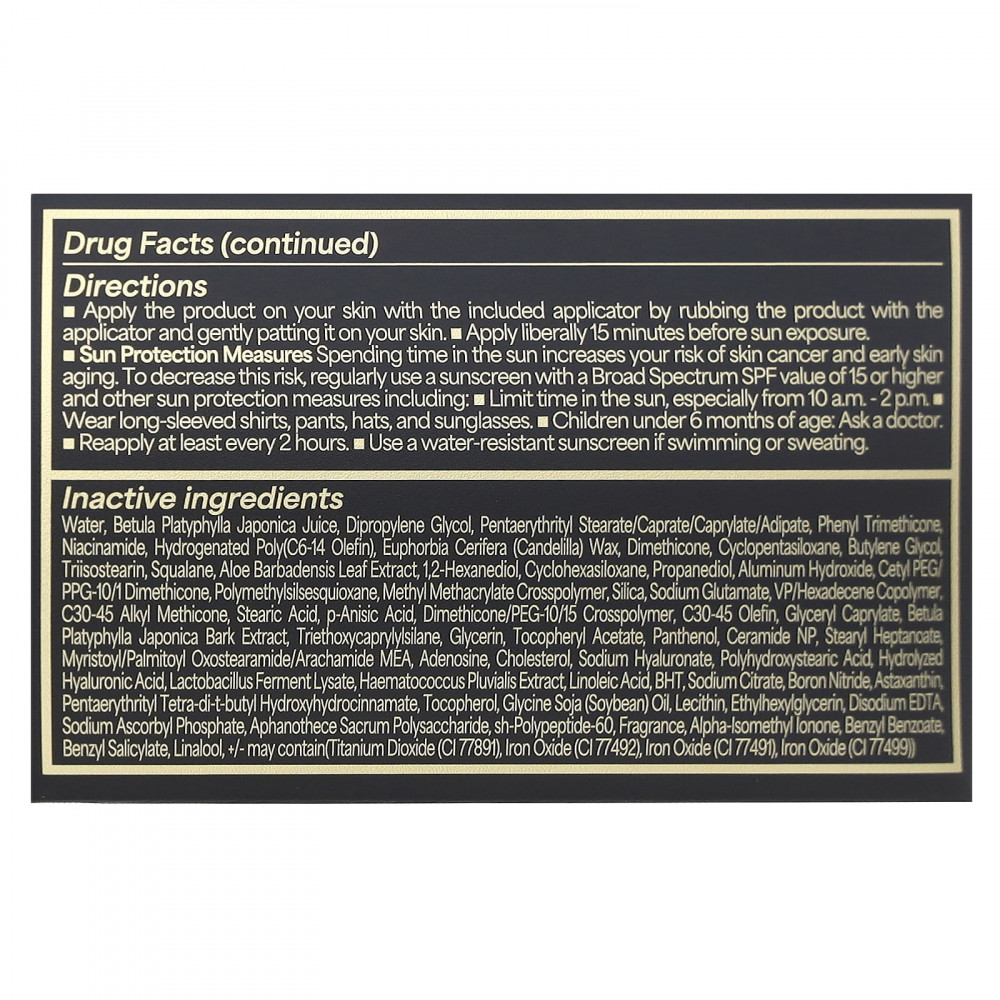 Вода, сок Betula platyphylla japonica, дипропиленгликоль, пентаэритритил стеарат / капрат / каприлат / адипат, фенилтриметикон, никотинамид, гидрогенизированный поли (С6-14 олефин), канделильский воск, диметикон, циклопентасиленгликоль, диметикон, циклопентасиленгликоль , экстракт листьев алоэ барбаденсис, 1,2-гександиол, циклогексасилоксан, пропандиол, гидроксид алюминия, цетил ПЭГ / ППГ-10/1 диметикон, полиметилсилсесквиоксан, метилметакрилат кроссполимер, диоксид кремния, натрия глутамат, вполимер / гексадецен сополимер , стеариновая кислота, пара-анисовая кислота, кроссполимер диметикон / ПЭГ-10/15, олефин c30-45, глицерил каприлат, экстракт коры бетулы платифиллы японской, триэтоксикаприлилсилан, глицерин, токоферилацетат, пантенол, церамидгептано / нп, пальмитоид нп, стеарилгептаноат оксостеарамид / арахамид, аденозин, холестерин, гиалуронат натрия, полигидроксистеариновая кислота, гидролизованная гиалуроновая кислота, ферментный лизат лактобактерий, гематококк плювиальный экстракт s, линолевая кислота, БГТ, цитрат натрия, нитрид бора, астаксантин, пентаэритритил тетра-ди-трет-бутил гидроксигидроциннамат, токоферол, соевое масло (глицин соя), лецитин, этилгексилглицерин, динатриевая соль эдтацеи, аскорбилфосфат натрия, sh-полипептид-60, отдушка, альфа-изометилионон, бензилбензоат, бензил салицилат, линалоол, +/- может содержать (диоксид титана (CI 77891), оксид железа (CI 77492), оксид железа (CI 77491), оксид железа (CI 77499).