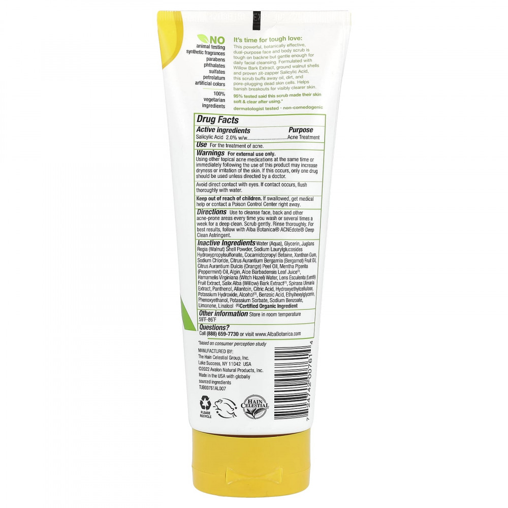 Используйте для очищения лица, спины и других участков, подверженных акне, каждый раз во время умывания или несколько раз в неделю для глубокого очищения. Аккуратно помассируйте. Тщательно смойте водой. Для достижения наилучших результатов используйте вяжущее средство для глубокого очищения Alba Botanica® Natural ACNEdote™.