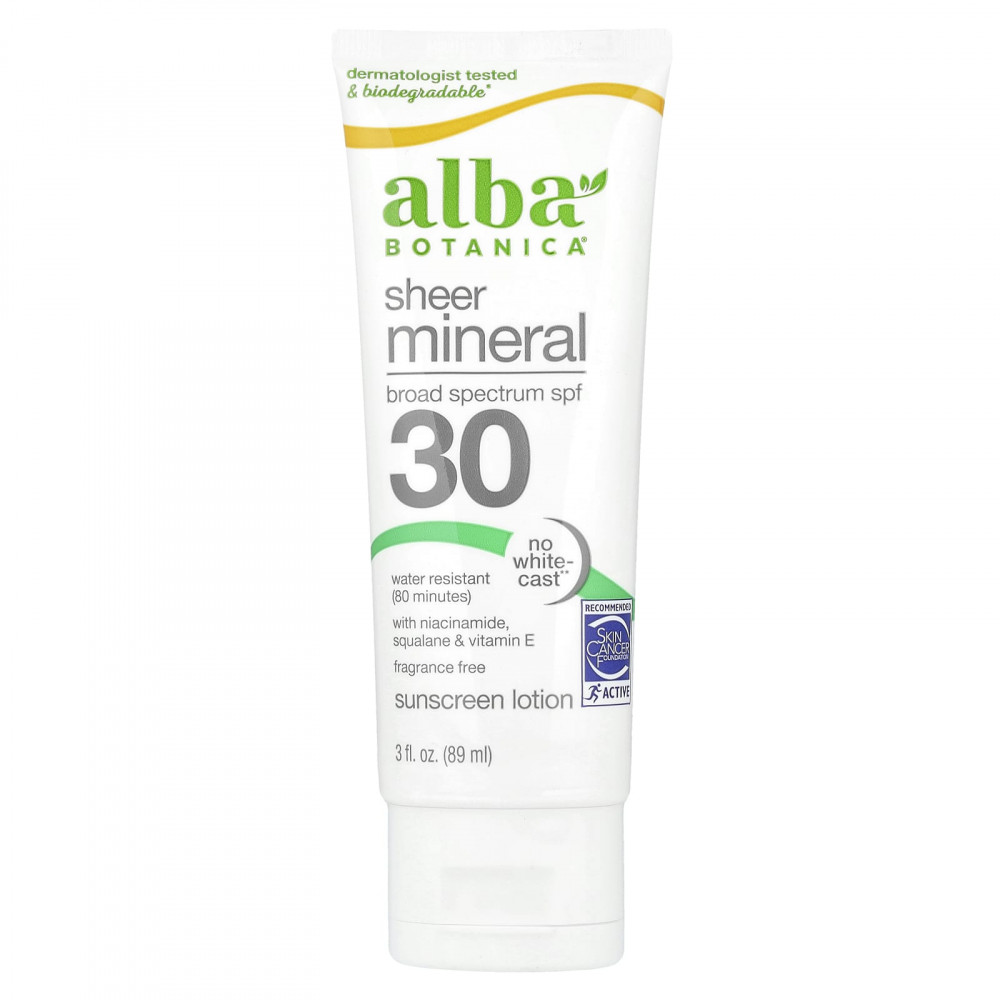 Увлажняйте и защищайте кожу с помощью солнцезащитного крема Alba Botanica Sheer Mineral SPF 30. Это легкое минеральное солнцезащитное средство широкого спектра действия обеспечивает защиту от солнечных ожогов и признаков преждевременного старения. Наш солнцезащитный крем обладает водостойкостью до 80 минут и содержит никотинамид, сквален и витамин Е. Не вызывает комедонов и гипоаллергенно, что делает его полезным даже для самой чувствительной кожи. Легко впитывается и хорошо сочетается с макияжем или под макияжем. Наша формула на 100% вегетарианская и не содержит наночастиц, оксибензона, октиноксата или синтетических отдушек.