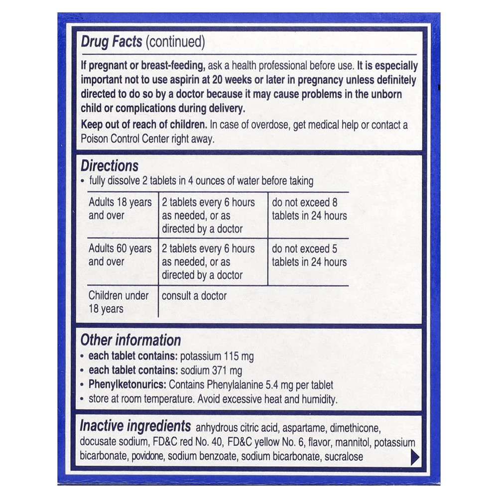 | Неактивные ингредиенты: безводная лимонная кислота, аспартам, диметикон, докузат натрия, краситель красный 40 FD&C, краситель желтый 6 FD&C, ароматизатор, маннит, бикарбонат калия, повидон, бензоат натрия, бикарбонат натрия, сукралоза. Каждая таблетка содержит: Калий - 115 мг Каждая таблетка содержит: 371 мг натрия Фенилкетонурия. Содержит фенилаланин 5,4 мг в одной таблетке. | |