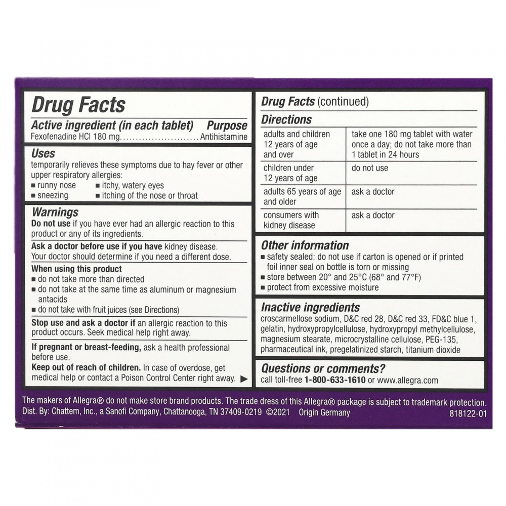 | Фексофенадина гидрохлорид, 180 мг | Оказывает антигистаминное действие |