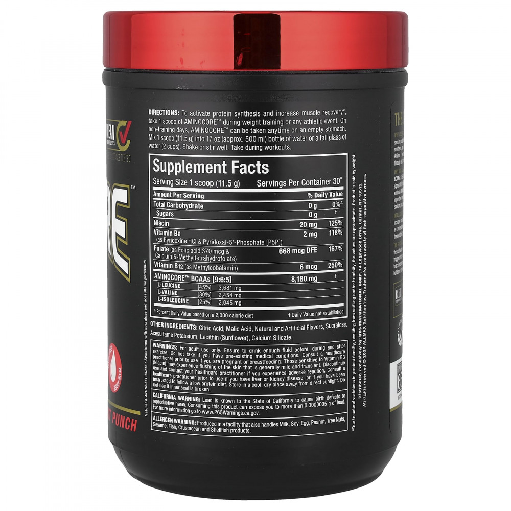 Зачем использовать Allmax Aminocore? Не все BCAA одинаковы. Aminocore содержит 8,18 г BCAA в соотношении 9:6:5, что обеспечивает усиление активации сигналов мышечного роста на 350%! Aminocore — самый чистый источник BCAA в свободной форме, без наполнителей или аминокислот, не относящихся к BCAA. BCAA Aminocore 9:6:5 на 100% чисты до начала ароматизации. Обычные источники с содержанием 2:1:1 включают примеси, приводящие к помутнению, маслянистой пене, осадку и, что еще хуже, неприятному горькому вкусу! Aminocore — это самая чистая и вкусная добавка с BCAA, которую можно купить за деньги!