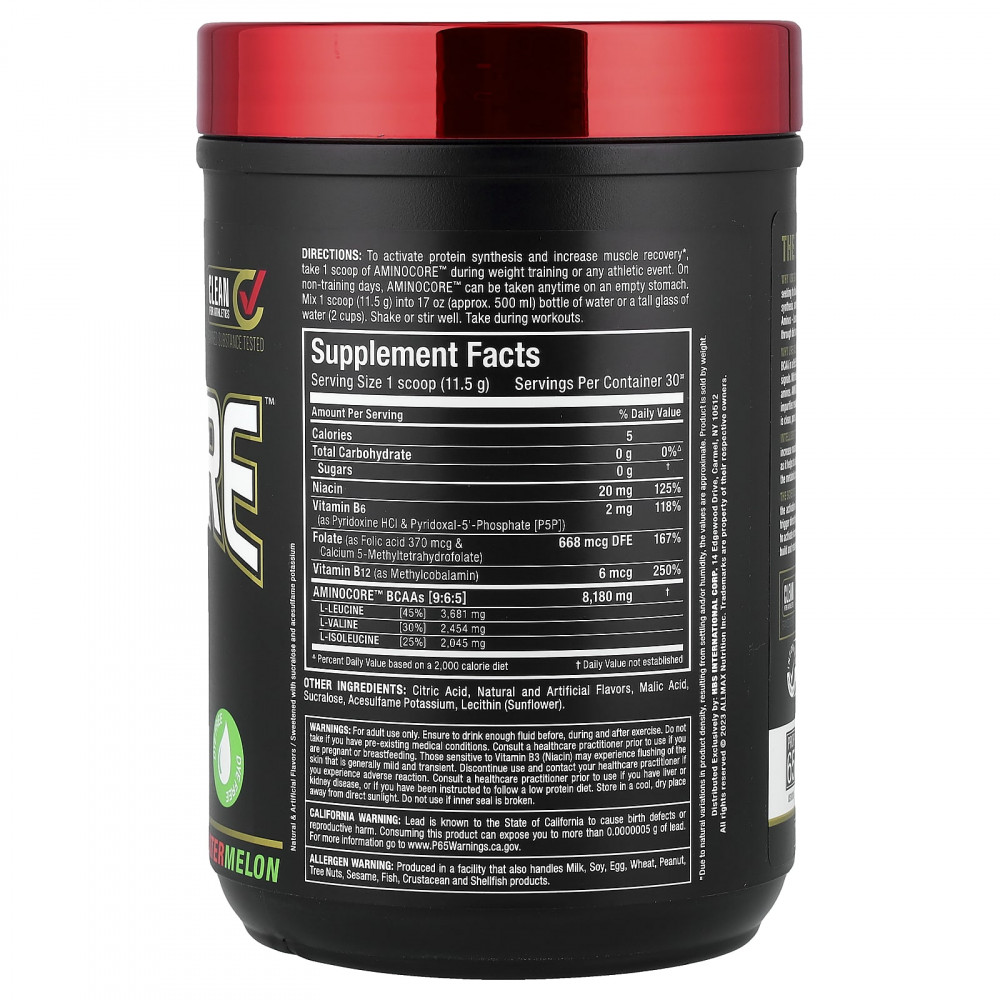Зачем использовать ALLMAX AMINOCORE? — Не все BCAA одинаковы. AMINOCORE содержит 8,18 г BCAA в клинически подтвержденном соотношении 9:6:5, которое обеспечивает усиление активации сигналов мышечного роста на 350%. Благодаря использованию чистого источника BCAA в свободной форме, AMINOCORE не содержит наполнителей или аминокислот, не относящихся к BCAA. BCAA AMINOCORE 9:6:5 очищаются и проверяются перед добавлением ароматизаторов, чтобы не содержать примесей, которые могут привести к помутнению, масляной пене, осадку и, что самое неприятное, к резкому горькому вкусу! Aminocore — это чистая и вкусная добавка с BCAA, которую можно купить за деньги!