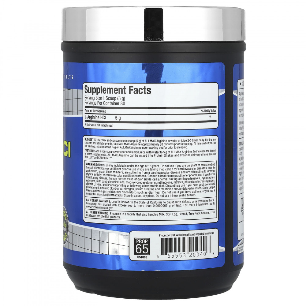 В AllMax используется аргинин в форме гидрохлорида для достижения максимальной стабильности и повышенной растворимости, а следовательно, и лучшего усвоения. Аргинин гидрохлорид — это ковалентно связанная, высокостабильная молекула, которая в настоящее время представляет собой лучшую добавку с аргинином.