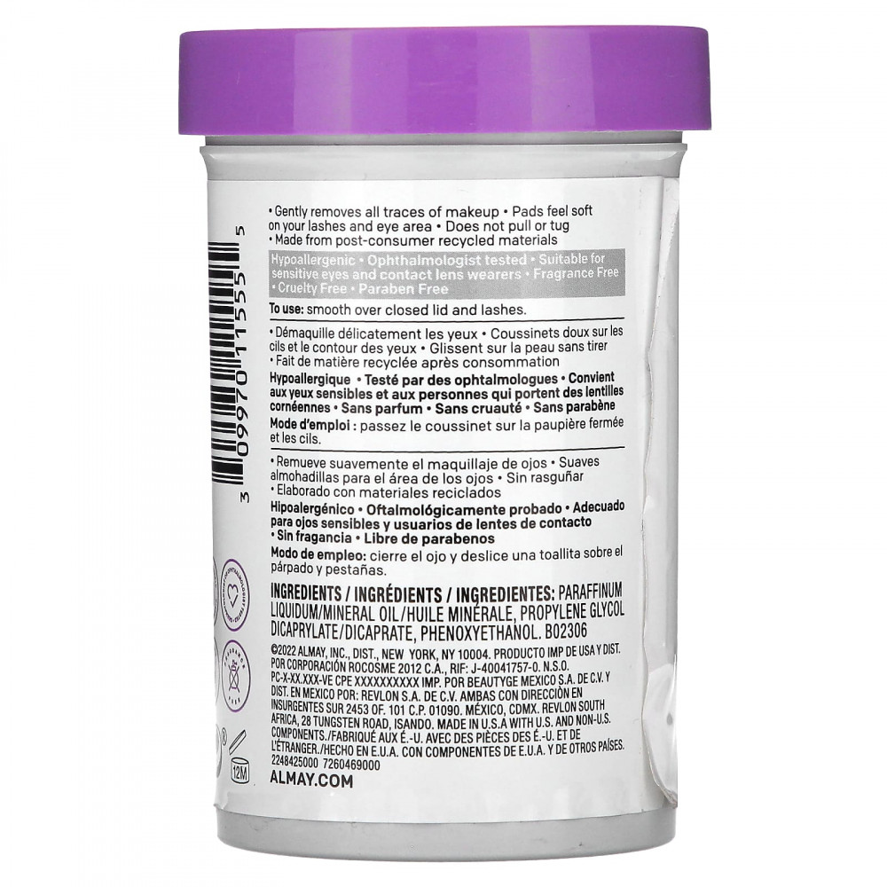 Бережно удаляет все следы макияжа. Мягкие подушечки для ресниц и области вокруг глаз. Не тянет и не дергает. Не оставляет жирных следов. Изготовлено из переработанных материалов.