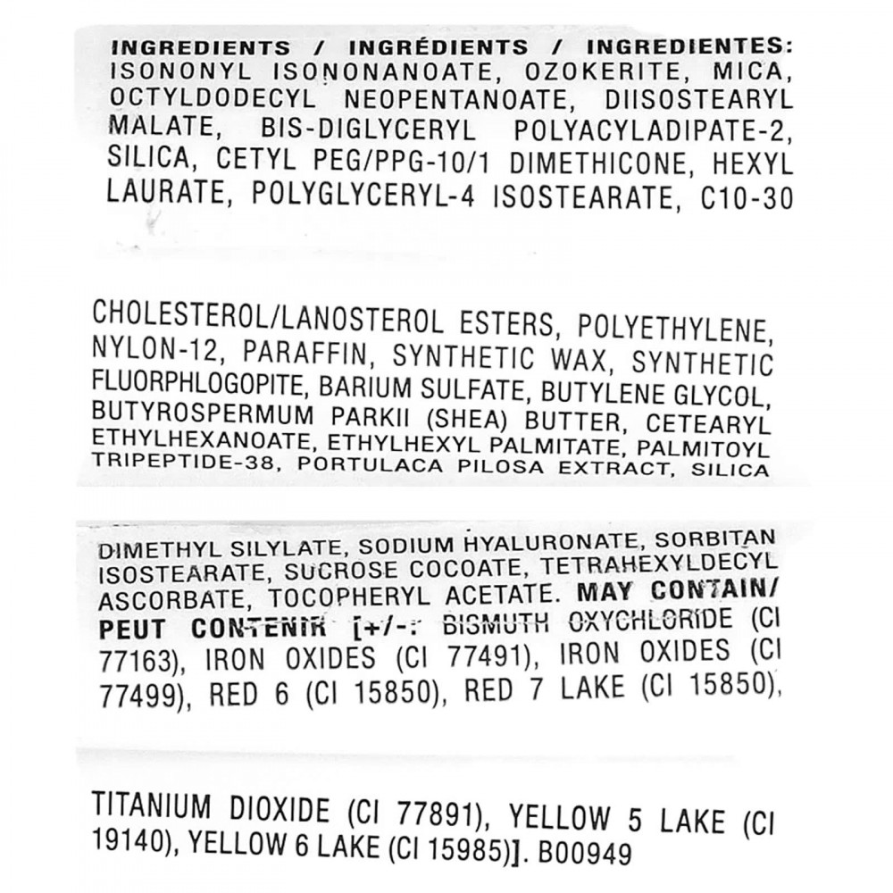 Изононил изононаноат, озокерит, слюда, октилдодецил неопентаноат, диизостеарил малат, бис-диглицерил полиациладипат-2, диоксид кремния, цетил ПЭГ/ППГ-10/1 диметикон, гексил лаурат, полиглицерил-4 изостеарат, c10-30, эфиры холестерина/ланостерола, полиэтилен, нейлон-12, парафина, синтетический воск, синтетический фторфлогопит, сульфат бария, бутиленгликоль, масло ши (Butyrospermum parkii), цетеариловый этилгексаноат, этилгексил пальмитат, пальмитоил трипептид-38, экстракт портулака волосистого (Portulaca pilosa), диоксид кремния, диметил силилат, гиалуронат натрия, сорбитан изостеарат, кокоат сахарозы, тетрагексилдецил аскорбат, токоферилацетат. может содержать оксихлорид висмута (CI 77163), оксиды железа (CI 77491), оксиды железа (CI 77499), краситель красный 6 (CI 15850), краситель красный 7 лак (CI 15850), диоксид титана (CI 77891), краситель желтый 5 лак (CI 19140), краситель желтый 6 лак (CI 15985)].