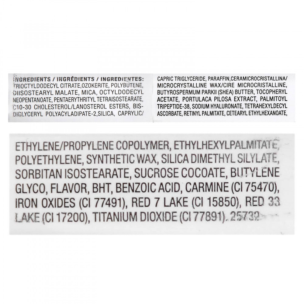 Феноктилдодецил цитрат, озокерит, полибутен, диизостеарил малат, слюда, октилдодецил неопентаноат, пентаэритритил тетраизостеарат, с10-30 холестерол/ланостерол эфиры, бис-диглицерил полиациладипат-2, диоксид кремния, каприловый/каприновый триглицерид, парафина, микрокристаллический воск Cera микрокристаллический, масло ши (Butyrospermum parkii), токоферилацетат, экстракт портулака волосистого (Portulaca pilosa), пальмитоил трипептид-38, гиалуронат натрия, тетрагексилдецил аскорбат, ретинилпальмитат, цетеариловый этилгексаноат, сополимер этилена/пропилена, этилгексил пальмитат, полиэтилен, синтетический воск, диметил силилат диоксида кремния, сорбитан изостеарат, кокоат сахарозы, бутилен глико, ароматизатор, бутилгидрокситолуол, бензойная кислота, кармин (CI 75470), оксиды железа (CI 77491), краситель красный 7 лак (CI 15850), краситель красный 33 лак (CI 17200), диоксид титана (CI 77891). 25732