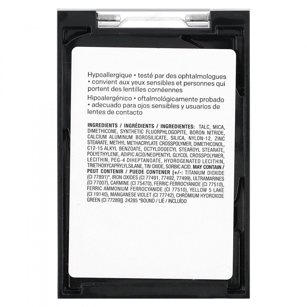 Тальк, слюда, диметикон, синтетический фторфлогопит, нитрид бора, кальций алюминий боросиликат, диоксид кремния, нейлон-12, стеарат цинка, метил метакрилат кроссполимер, диметиконол, c12-15 алкил бензоат, октилдодецил стеароил стеарат, полиэтилен, адипиновая кислота/неопентилгликоль кроссполимер, лецитин, ПЭГ-4 дигептаноат, гидрогенизированный лецитин, триэтоксикаприлилсилан, оксид олова, сорбиновая кислота. Может содержать [+/-: диоксид титана (CI 77891)*, оксиды железа (CI 77491,77492,77499), ультрамарины (CI 77007), кармин (CI 75470), берлинскую лазурь (CI 77510), ферроцианид железа и аммония (CI 77510), краситель жёлтый 5 лак (CI 19140), краситель темно-фиолетовый (CI 77742), зеленый гидроксид хрома (CI 77289)].