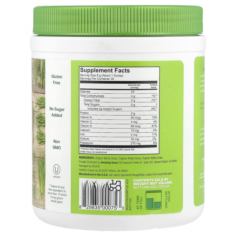 Наш органический порошок Amazing Trio представляет собой цельный лист, а не сок. Таким образом, одна мерная ложка является питательным эквивалентом более чем 10 порций ростков пшеницы, выращенных на лотках.