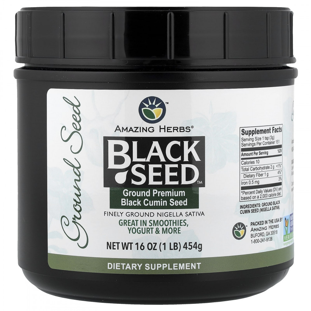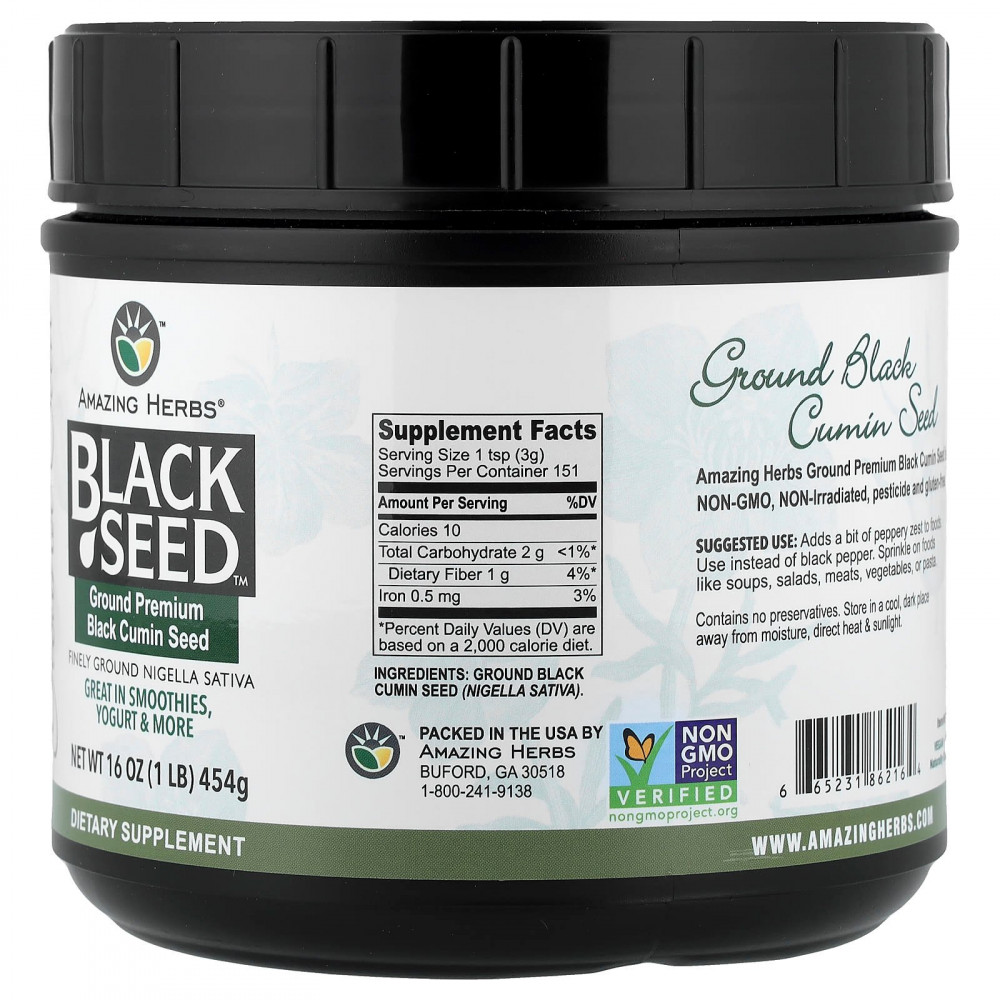 Молотые семена черного тмина премиального качества от Amazing Herbs не содержат ГМО, не подвергались излучению, пестицидам и глютена.