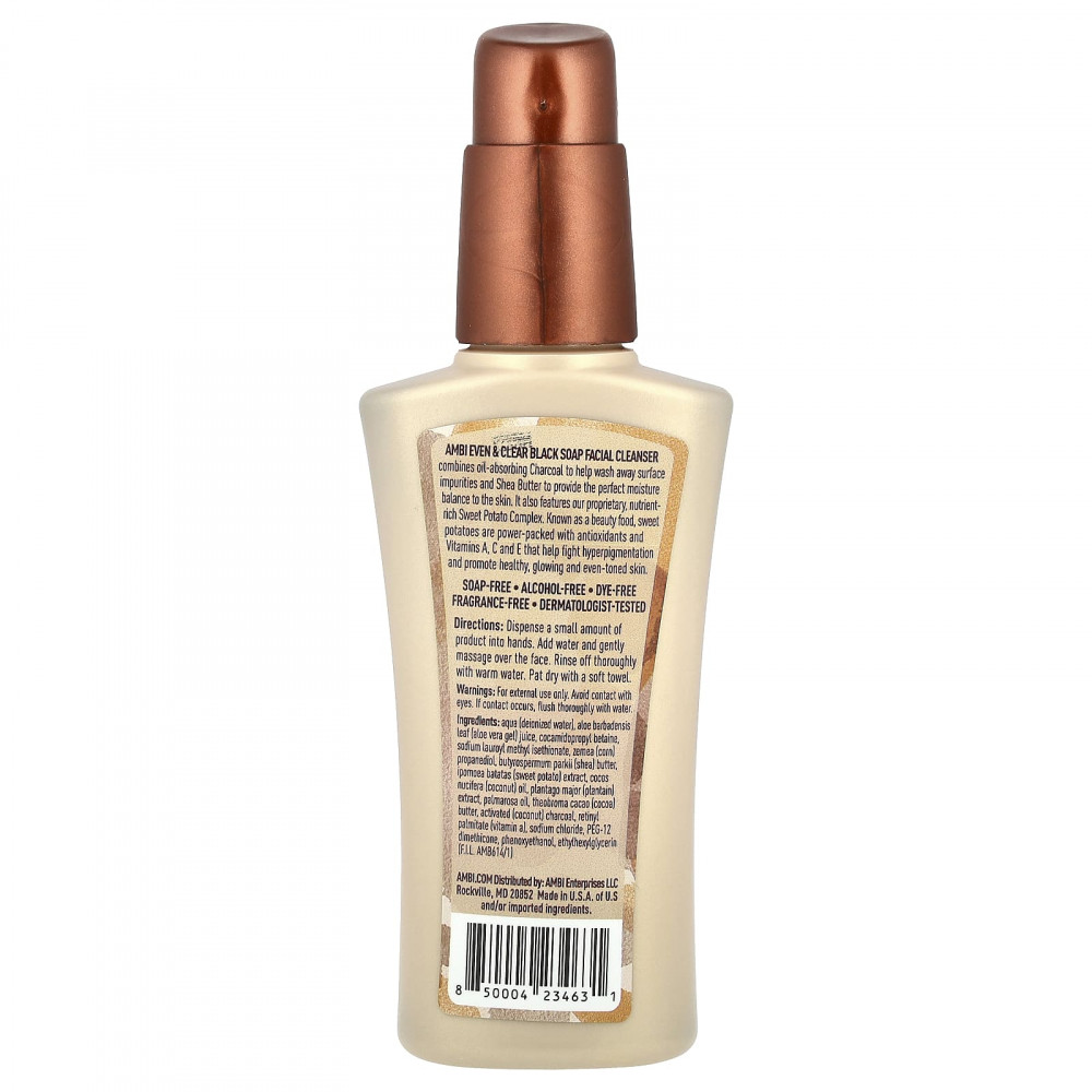 Очищающее средство для лица с черным мылом Ambi Even & Clear сочетает в себе абсорбирующий жир древесный уголь, который помогает смыть поверхностные загрязнения, и масло ши, чтобы обеспечить идеальный баланс влаги в коже. Он также содержит наш запатентованный, богатый питательными веществами комплекс батата. Батат, известный как косметическое средство, богат антиоксидантами и витаминами A, C и E, которые помогают бороться с гиперпигментацией и способствуют здоровью, сиянию и ровному тону кожи.