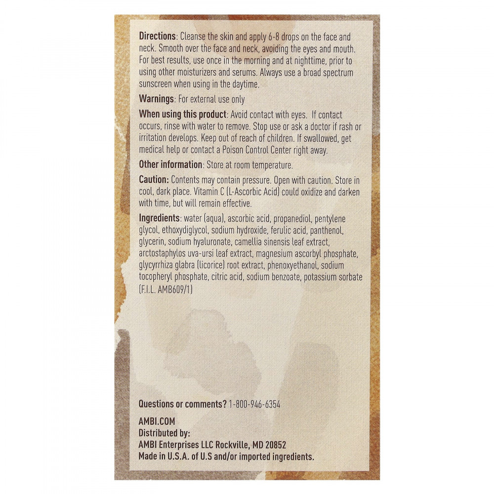 AMBI Even & Clear 20% Vitamin C Glow Serum - легкая, быстро впитывающаяся сыворотка, которая помогает уменьшить появление пигментных пятен и пигментных пятен. Эта сыворотка, в состав которой входят 20% витамина С, гиалуроновая кислота, корень солодки и другие натуральные ингредиенты, поможет достичь ровного тона кожи и сохранить здоровое сияние.