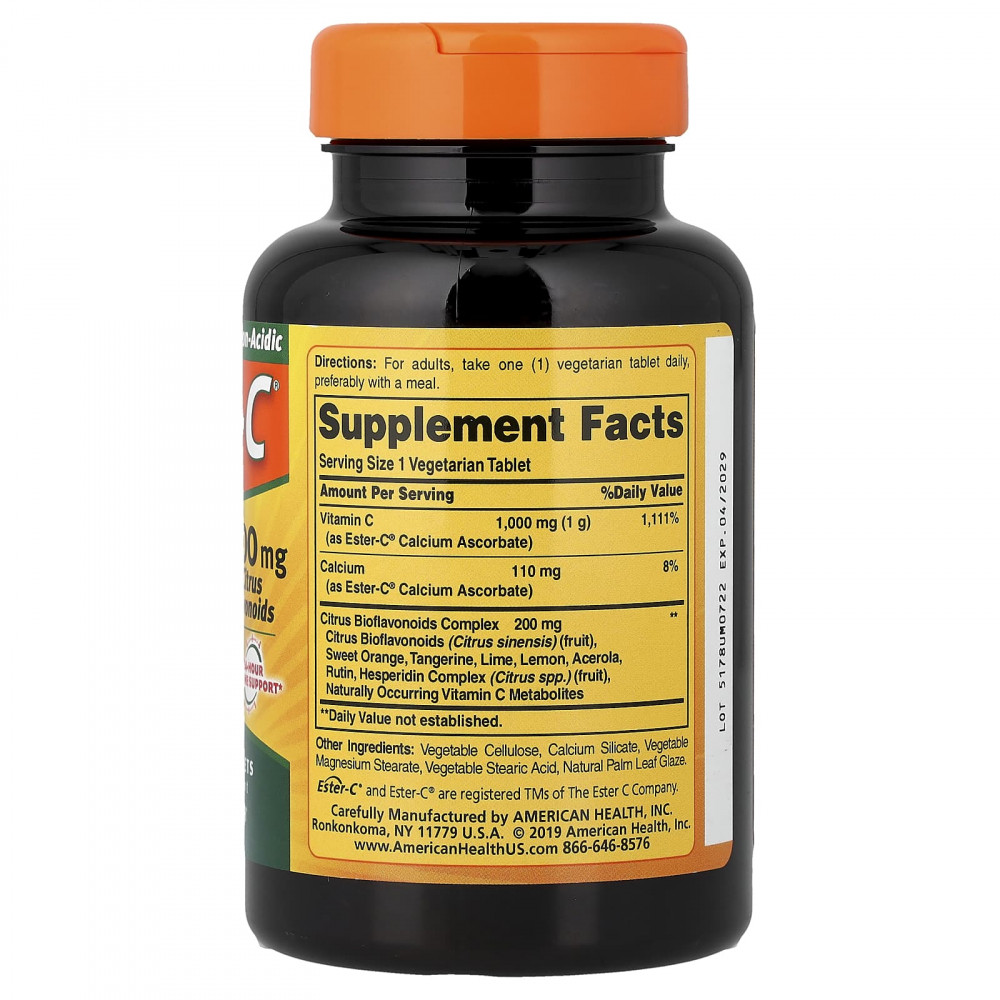 Ester-C® — это уникальная революционная формула витамина С, содержащая метаболиты природного происхождения. Метаболиты способствуют удержанию витамина С белыми кровяными клетками, который является важной частью иммунной системы. Технология производства Ester-C® на водной основе нейтрализует pH, делает его некислым и щадящим для желудка. В суточной дозе 1000 мг Ester-C® обеспечивает круглосуточную иммунную поддержку... поэтому вам достаточно одного раза в день. Добавленные биофлавоноиды цитрусовых могут помочь организму лучше усваивать и использовать витамин С.