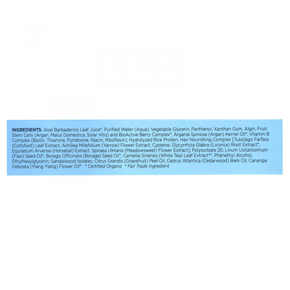 Сок листьев алоэ вера (Aloe barbadensis)*, очищенная вода (Aqua), растительный глицерин, пантенол, ксантановая камедь, альгинат натрия (альгин), стволовые клетки плодов [арганы, яблони домашней (Malus domestica), винограда (Solar vitis)] и биоактивный комплекс из 8 ягод*, масло из косточек арганы (Argania spinosa)*, комплекс витаминов группы B (биотин, тиамин, пиридоксин, ниацин, рибофлавин), гидролизованный рисовый протеин, комплекс для восстановления волос [экстракт листьев мать-и-мачехи (Tussilago farfara), экстракт цветков тысячелистника (Achillea millefolium), цистеин, экстракт корня солодки (Glycyrrhiza glabra)*, экстракт хвоща полевого (Equisetum arvense), экстракт цветков таволги (Spiraea ulmaria)], гидролизованный соевый протеин, полисорбат 20, масло из семян льна (Linum usitatissimum)*, масло из семян бурачника (Borago officinalis)*, экстракт листьев белого чая (Camellia sinensis)*†, экстракт цветков розеллы (Hibiscus sabdariffa)*†, фенетиловый спирт, этилгексилглицерин, изоляты сандалового дерева, масло из кожуры грейпфрута (Citrus grandis), масло коры кедра атласского (Cedrus atlantica), масло из цветков иланг-иланга (Cananga odorata)*