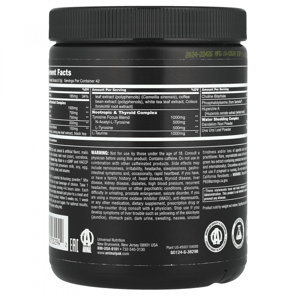 Animal Cuts® - это мощный жиросжигающий порошок. Смешайте 1 мерную ложку с 8–10 унциями напитка по вашему выбору. Принимайте по 1 порции после пробуждения, а вторую - через 4–6 часов. Каждую порцию следует принимать натощак непосредственно перед едой и поддерживать достаточный уровень жидкости во время приема продукта. Продолжайте курс через 3 недели, перерыв в течение 1 недели. После недельного отдыха можно снова начать принимать продукт. Для достижения оптимальных результатов обязательно соблюдайте строгую диету.