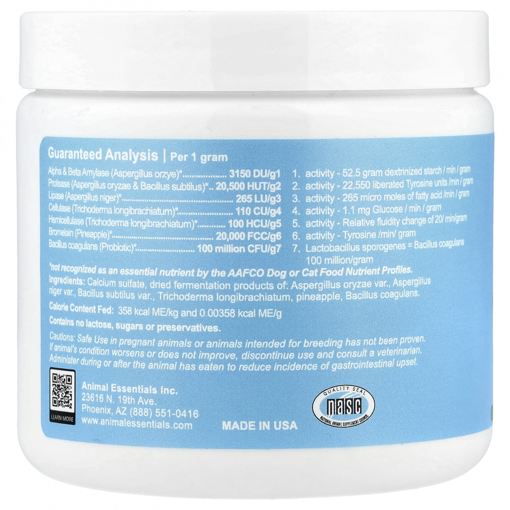 Содержит источник живых (жизнеспособных) микроорганизмов природного происхождения. Восполняет запасы полезных бактерий (пробиотиков), поддерживающих пищеварительную флору, и ферментов, которые помогают расщеплять крахмалы, белки, триглицериды и жиры, а также целлюлозу (растительные материалы и клетчатку) в рационе.