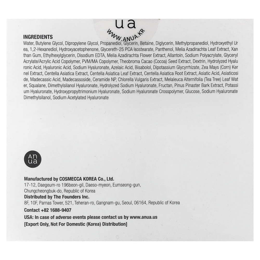 *Anua азотный комплекс Calming Complex™: вода, 1,2-гександиол, этилгексилглицерин, азелаиновая кислота, вода из листьев чайного дерева (Melaleuca alternifolia), экстракт хлореллы (Chlorella vulgaris), мадекассосид, азиатикозид, мадекассовая кислота, азиатиковая кислота, экстракт листьев готу колы (Centella asiatica), экстракт корня готу колы (Centella asiatica), экстракт готу колы (Centella asiatica), сквалан, керамид NP.