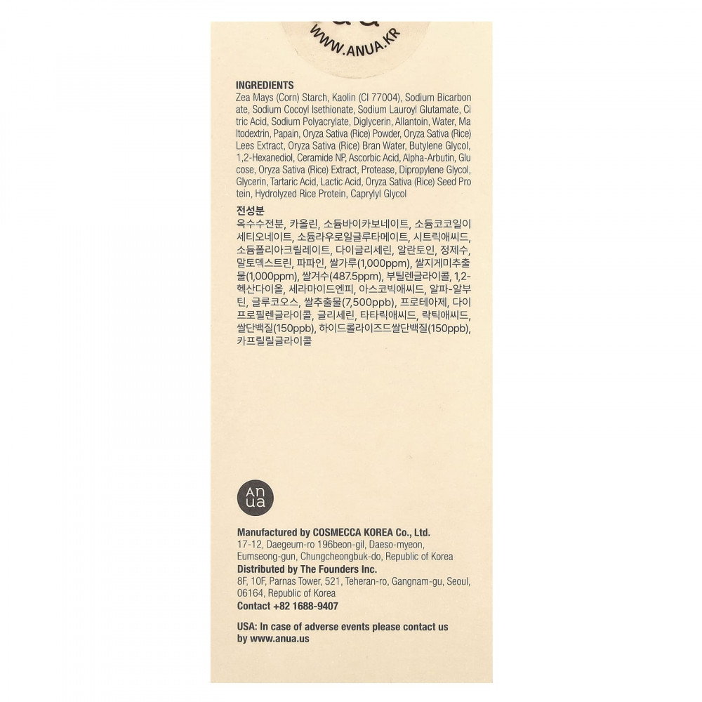 Кукурузный крахмал (Zea mays), каолин (CI 77004), бикарбонат натрия, кокоил изетионат натрия, натрия лауроил глутамат, лимонная кислота, полиакрилат натрия, диглицерин, аллантоин, вода, майтодекстрин, папаин, порошок из риса (Oryza sativa), экстракт осадка (Oryza sativa), вода из рисовых отрубей (Oryza sativa), бутиленгликоль, 1,2-гександиол, керамид NP, аскорбиновая кислота, альфа-арбутин, глюкоза, экстракт риса (Oryza sativa), протеаза, дипропиленгликоль, глицерин, винная кислота, молочная кислота, протеин из семян риса (Oryza sativa), гидролизованный рисовый протеин, каприлилгликоль.