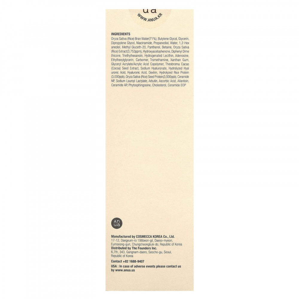 Вода из рисовых отрубей (Oryza sativa) (71%), бутиленгликоль, глицерин, дипропиленгликоль, никотинамид, пропандиол, вода, 1,2-гександиол, метил глюцет-20, пантенол, бетаин, экстракт риса (Oryza sativa) (3753 част. / млн), гидроксиацетофенон, дифенил диметикон, триэтилгексаноин, гидрогенизированный лецитин, аденозин, этилгексилглицерин, карбомер, трометамин, ксантановая камедь, сополимер глицерил акрилата/акриловой кислоты, экстракт зерен какао (Theobroma cacao), гиалуронат натрия, гидролизованная гиалуроновая кислота, гиалуроновая кислота, декстрин, гидролизованный рисовый белок (3000 част. / млрд), белок семян риса (Oryza sativa) (3000 част. / млрд), керамид NP, натрия лауроил лактилат, арбутин, аскорбиновая кислота, аллантоин, керамид АP, фитосфингозин, холестерина, керамид EOP.