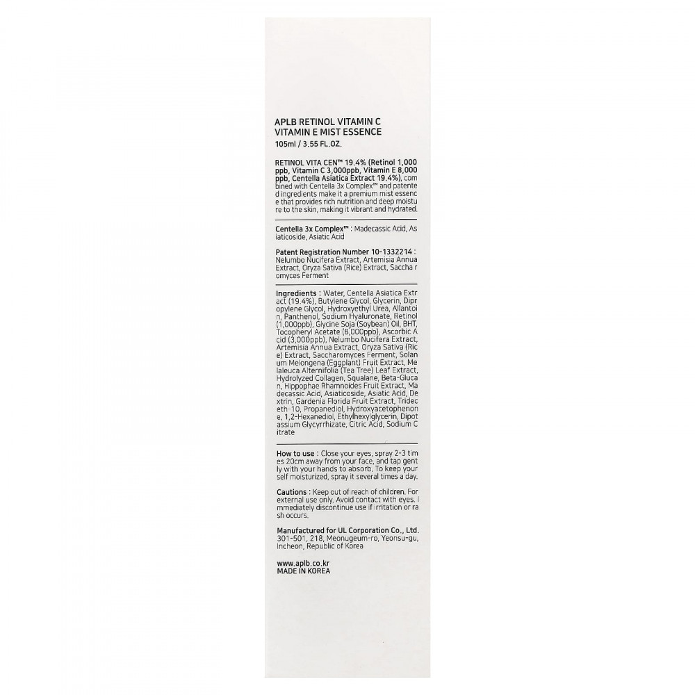 Retinol Vita Cen™ 19,4% (ретинол 1000 част./млрд, витамин C 3000 част./млрд, витамин E 8000 част./млрд, экстракт готу колы (Centella asiatica) 19,4%) в сочетании с Centella 3x Complex™ и запатентованными ингредиентами делают ее эссенцией-спрей премиального качества, которая обеспечивает насыщенное питание и глубокое увлажнение. коже, делая ее сияющей и увлажненной.