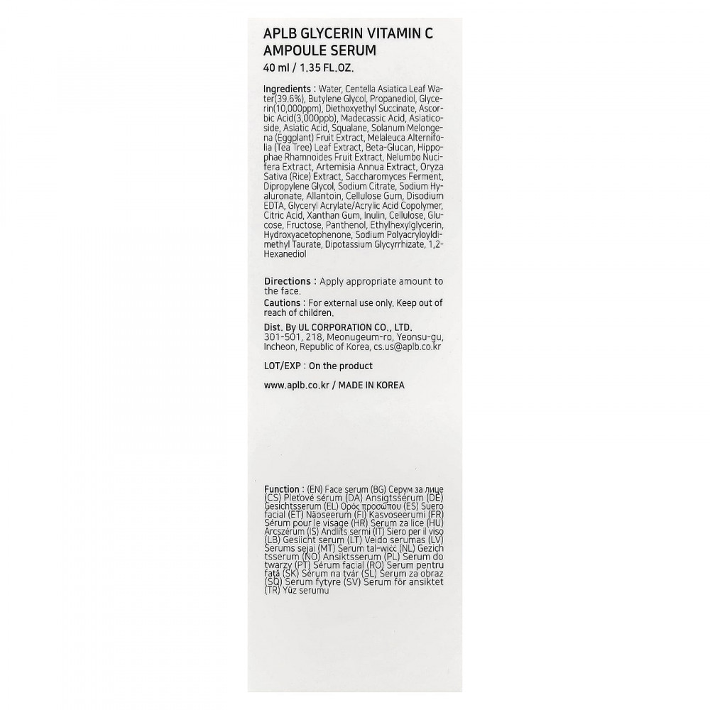 Вода, вода из листьев центеллы азиатской (39,6%), бутиленгликоль, пропандиол, глицерин (10 000 част. / млн), диэтоксиэтил сукцинат, аскорбиновая кислота (3000 част. / млрд), мадекассовая кислота, азиатикозид, азиатиковая кислота, сквалан, экстракт плодов баклажана (Solanum melongena), экстракт листьев чайного дерева (Melaleuca alternifolia), бета-глюкан, экстракт плодов облепихи крушиновидной (Hippophae rhamnoides), экстракт лотоса орехоносного (Nelumbo nucifera), экстракт полыни однолетней (Artemisia annua), экстракт риса (Oryza sativa), продукт ферментации сахаромицетов, дипропиленгликоль, цитрат натрия, гиалуронат натрия, аллантоин, целлюлозная камедь, двунатриевая ЭДТК, сополимер глицерил акрилата/акриловой кислоты, лимонная кислота, ксантановая камедь, инулин, целлюлоза, глюкоза, фруктоза, пантенол, этилгексилглицерин, гидроксиацетофенон, полиакрилодиметил таурат натрия, дикалия глицирризат, 1,2-гександиол.