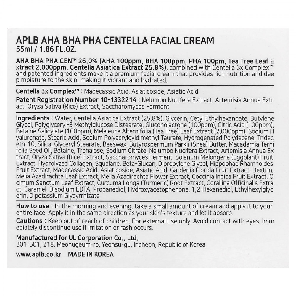 АГК и БГК PHA CEN™ 26,0% (АГК 100 част./млн, БГК 100 част./млн, ПГК 100 част./млн, экстракт листьев чайного дерева, 2000 част./млн, экстракт готу колы (Centella asiatica) 25,8%) в сочетании с комплексом Centella 3x Complex™ и запатентованными ингредиентами делают этот крем для лица премиального качества питательным глубоко увлажняет кожу, делая ее сияющей и увлажненной.