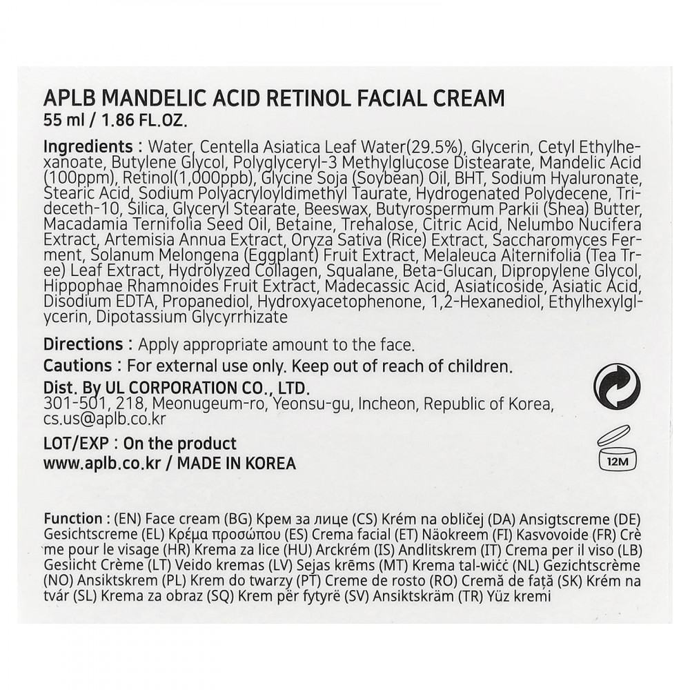 Вода, вода из листьев центеллы азиатской (29,5%), глицерин, цетилэтилгексаноат, бутиленгликоль, полиглицерил-3 метилглюкозы дистеарат, миндальная кислота (100 част. / млн), ретинол (1000 част. / млрд), соевое масло (Glycine soja), бутилгидрокситолуол, гиалуронат натрия, стеариновая кислота, полиакрилодиметил таурат натрия, гидрогенизированный полидецен, тридецет-10, диоксид кремния, глицерил стеарат, пчелиный воск, масло ши (Butyrospermum parkii), масло макадамии (Macadamia ternifolia), бетаин, трегалоза, лимонная кислота, экстракт лотоса орехоносного (Nelumbo nucifera), экстракт полыни однолетней (Artemisia annua), экстракт риса (Oryza sativa), продукт ферментации сахаромицетов, экстракт плодов баклажана (Solanum melongena), экстракт листьев чайного дерева (Melaleuca alternifolia), гидролизованный коллаген, сквалан, бета-глюкан, дипропиленгликоль, экстракт плодов облепихи крушиновидной (Hippophae rhamnoides), мадекассовая кислота, азиатикозид, азиатиковая кислота, двунатриевая ЭДТК, пропандиол, гидроксиацетофенон, 1,2-гександиол, этилгексилглицерин, дикалия глицирризат.