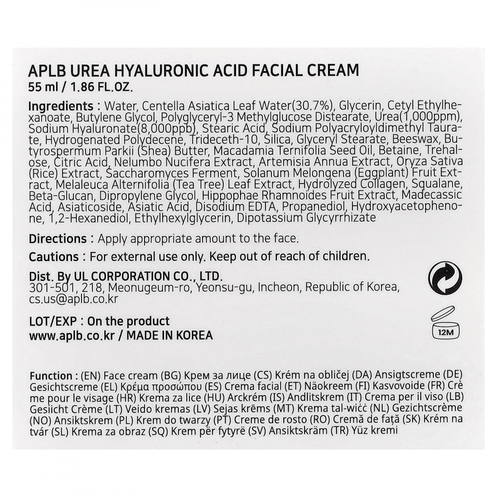 Вода, вода из листьев центеллы азиатской (30,7%), глицерин, цетилэтилгексаноат, бутиленгликоль, полиглицерил-3 метилглюкозы дистеарат, мочевина (1000 част. / млн), гиалуронат натрия (8000 част. / млрд), стеариновая кислота, полиакрилодиметил таурат натрия, гидрогенизированный полидецен, тридецет-10, диоксид кремния, глицерил стеарат, пчелиный воск, масло ши (Butyrospermum parkii), масло макадамии (Macadamia ternifolia), бетаин, трегалоза, лимонная кислота, экстракт лотоса орехоносного (Nelumbo nucifera), экстракт полыни однолетней (Artemisia annua), экстракт риса сатива (Oryza sativa), продукт ферментации сахаромицетов, экстракт плодов баклажана (Solanum melongena), экстракт листьев чайного дерева (Melaleuca alternifolia), гидролизованный коллаген, сквалан, бета-глюкан, дипропиленгликоль, экстракт плодов облепихи крушиновидной (Hippophae rhamnoides), мадекассовая кислота, азиатикозид, азиатиковая кислота, двунатриевая ЭДТК, пропандиол, гидроксиацетофенон, 1,2-гександиол, этилгексилглицерин, дикалия глицирризат.