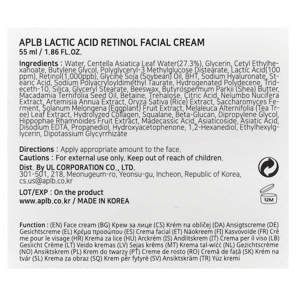 Вода, вода из листьев центеллы азиатской (27,3%), глицерин, цетилэтилгексаноат, бутиленгликоль, полиглицерил-3 метилглюкозы дистеарат, молочная кислота (100 част. / млн), ретинол (1000 част. / млрд), соевое масло (Glycine soja), бутилгидрокситолуол, гиалуронат натрия, стеариновая кислота, полиакрилодиметил таурат натрия, гидрогенизированный полидецен, тридецет-10, диоксид кремния, глицерил стеарат, пчелиный воск, масло ши (Butyrospermum parkii), масло макадамии (Macadamia ternifolia), бетаин, трегалоза, лимонная кислота, экстракт лотоса орехоносного (Nelumbo nucifera), экстракт полыни однолетней (Artemisia annua), экстракт риса (Oryza sativa), продукт ферментации сахаромицетов, экстракт плодов баклажана (Solanum melongena), экстракт листьев чайного дерева (Melaleuca alternifolia), гидролизованный коллаген, сквалан, бета-глюкан, дипропиленгликоль, экстракт плодов облепихи крушиновидной (Hippophae rhamnoides), мадекассовая кислота, азиатикозид, азиатиковая кислота, двунатриевая ЭДТК, пропандиол, гидроксиацетофенон, 1,2-гександиол, этилгексилглицерин, дикалия глицирризат.