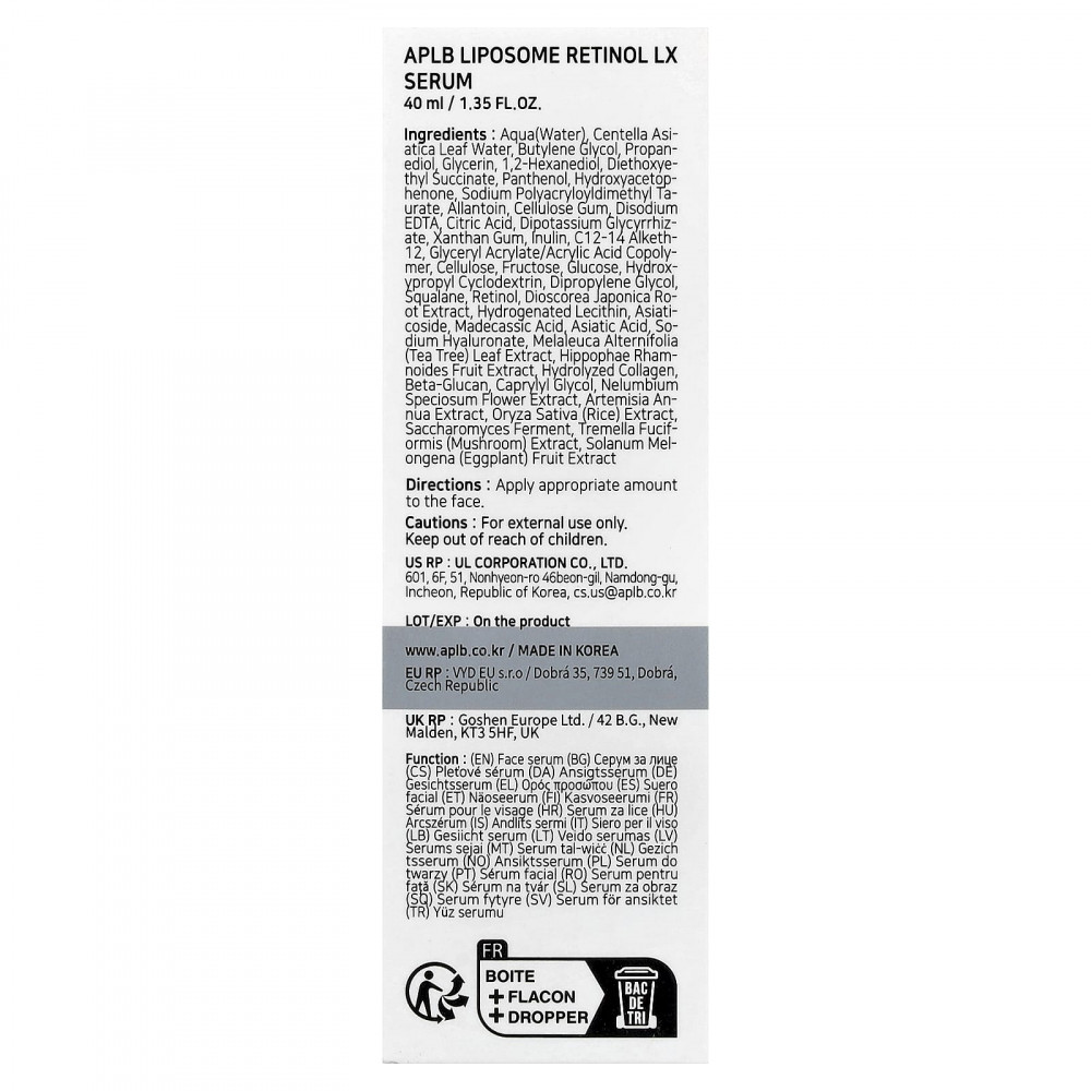 Вода, вода из листьев готу колы (Centella asiatica), бутиленгликоль, пропандиол, глицерин, 1,2-гександиол, диэтоксиэтил сукцинат, пантенол, гидроксиацетофенон, полиакрилодиметил таурат натрия, аллантоин, целлюлозная камедь, двунатриевая ЭДТК, лимонная кислота, дикалия глицирризат, ксантановая камедь, инулин, c12-14 алкет- 12, сополимер глицерил акрилата/акриловой кислоты, целлюлоза, фруктоза, глюкоза, гидроксипропил циклодекстрин, дипропиленгликоль, сквалан, ретинол, экстракт корня диоскореи японской (Dioscorea japonica), гидрогенизированный лецитин, азиатикозид, мадекассовая кислота, азиатиковая кислота, гиалуронат натрия, экстракт листьев чайного дерева (Melaleuca alternifolia), экстракт плодов облепихи крушиновидной (Hippophae rhamnoides), гидролизованный коллаген, бета-глюкан, каприлилгликоль, экстракт цветков лотоса (Nelumbium speciosum), экстракт полыни однолетней (Artemisia annua), экстракт риса (Oryza sativa), продукт ферментации сахаромицетов, экстракт снежного гриба (Tremella fuciformis), экстракт плодов баклажана (Solanum melongena).