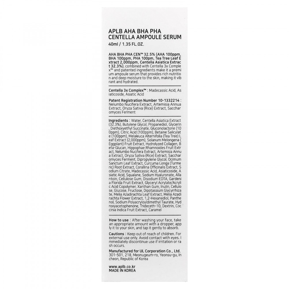 АГК, БГК и ПГК Cen™ 32,5% (АГК 100 част./млн, БГК 100 част./млн, ПГК 100 част./млн, экстракт листьев чайного дерева, 2000 част./млн, экстракт готу колы (Centella asiatica) 32,3%) в сочетании с комплексом Centella 3x Complex™ и запатентованными ингредиентами делают эту сыворотку премиального качества обеспечивает интенсивное питание и глубокое увлажнение кожи, делая ее сияющей и увлажненной.