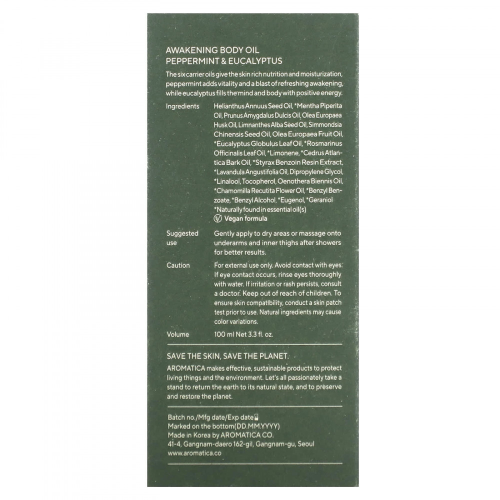 Шесть масел-носителей обеспечивают коже богатое питание и увлажнение, мята перечная придает жизненную силу и освежает кожу, а эвкалипт наполняет разум и тело положительной энергией.