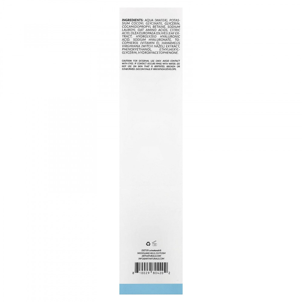 Пенка для умывания artnaturals® содержит смесь гиалуроновой кислоты, гамамелиса, витамина Е и экстракта оливы, которые мягко очищают и освежают кожу, удаляя загрязнения и поддерживая баланс.