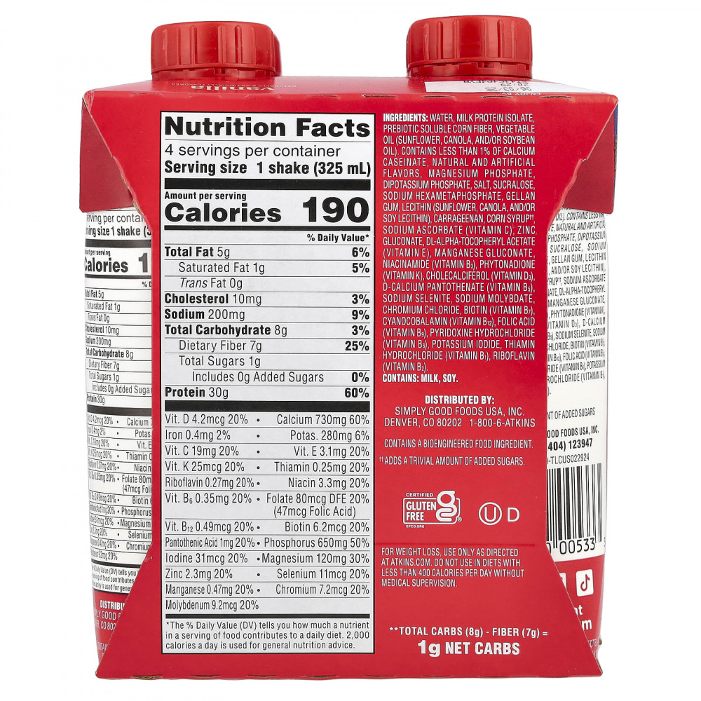 Вода, изолят молочного протеина, растворимая кукурузная клетчатка с пребиотиками, масло растительное (подсолнечное, канолы, и / или соевое масло), содержит менее 1% казеината кальция, натуральные и искусственные ароматизаторы, фосфат магния, дикалийфосфат, соль, сукралоза, гексаметафосфат натрия, геллановая камедь, лецитин (из подсолнечника, канолы, сои), каррагинан, кукурузный сироп ††, аскорбат натрия (витамин С), глюконат цинка, dl-альфа-токоферилацетат (витамин E), глюконат марганца, ниацинамид (витамин B3), фитонадион (витамин К), холекальциферол (витамин d3), d-пантотенат кальция (витамин B5), селенит натрия, молибдат натрия, хлорид хрома, биотин (витамин B7), цианокобаламин (витамин B12), фолиевая кислота (витамин B9), пиридоксина гидрохлорид (витамин B6), йодид калия, тиамина гидрохлорид (витамин B1), рибофлавин (витамин B2).