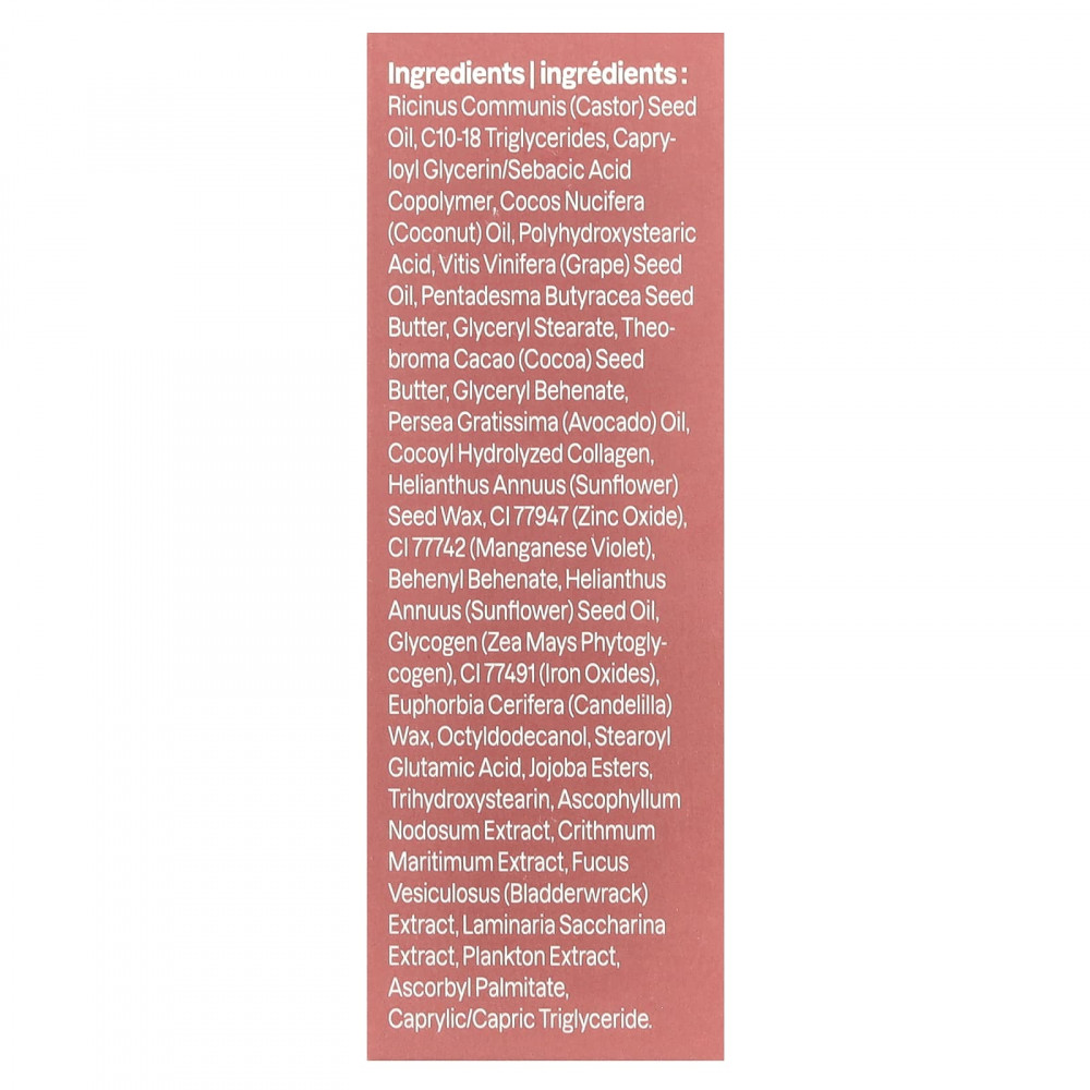 Касторовое масло (Ricinus communis), c10-18 триглицериды, сополимер каприлоил глицерина и себациновой кислоты, кокосовое масло (Cocos nucifera), полигидроксистеариновая кислота, масло из виноградных косточек (Vitis vinifera), масло из семян пентадесмы бутирасовой (Pentadesma butyracea), глицерил стеарат, масло из зерен какао (Theobroma cacao), глицерил бегенат, масло авокадо (Persea gratissima), кокоил гидролизованный коллаген, воск из семян подсолнечника (Helianthus annuus), CI 77947 (оксид цинка), CI 77742 (марганцево-фиолетовый), бегенил бегенат, подсолнечное масло (Helianthus annuus), гликоген (фитогликоген zea mays), CI 77491 (оксиды железа), канделильский воск (Euphorbia cerifera), октилдодеканол, стеароил глутаминовая кислота, эфиры жожоба, тригидроксистеарин, экстракт аскофиллума (Ascophyllum nodosum), экстракт критмума (Crithmum maritimum), экстракт фукуса (Fucus vesiculosus), экстракт ламинарии сахаристой (Laminaria saccharina), экстракт планктона, аскорбил пальмитат, каприловый / каприновый триглицерид.