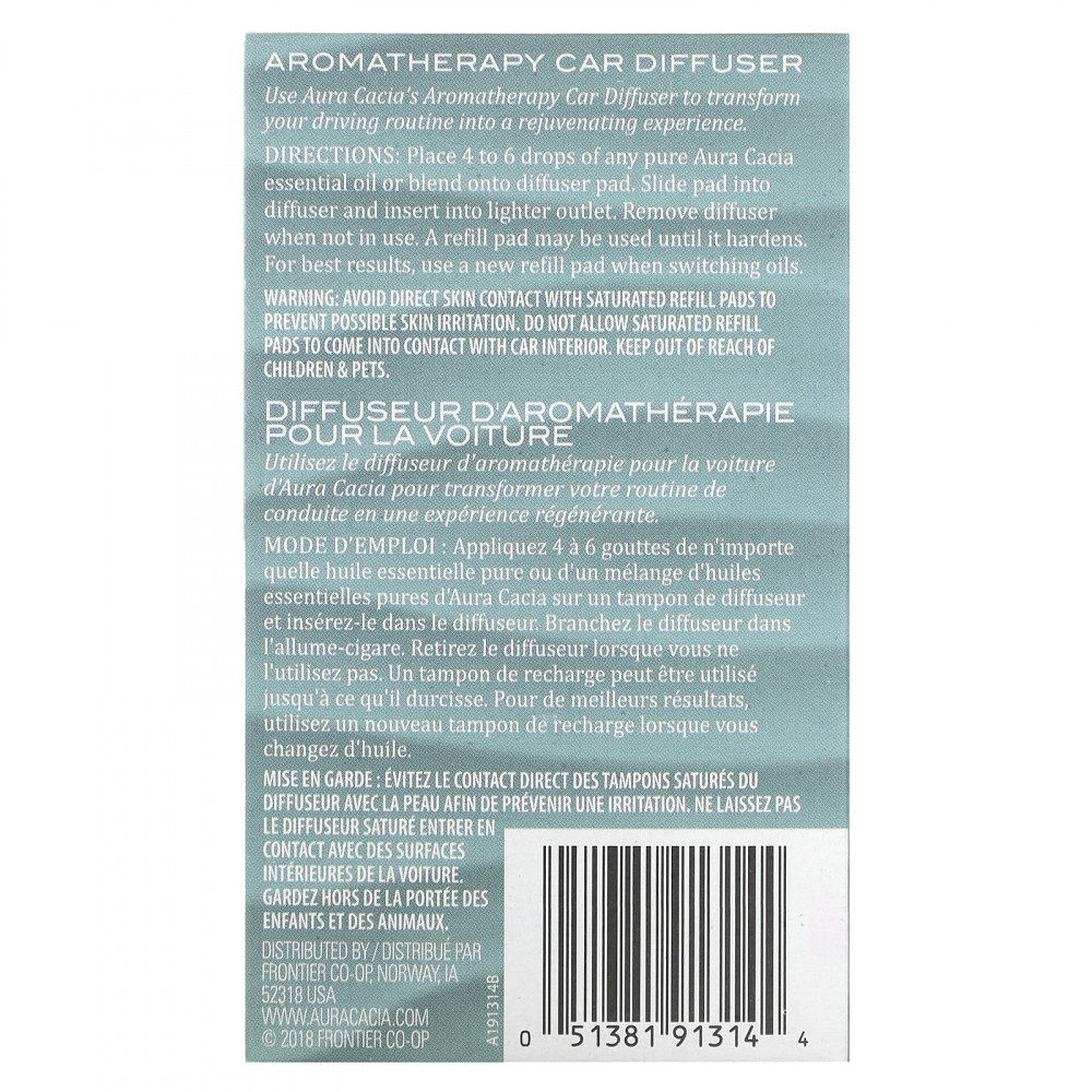 Применение. Нанесите 4–6 капель любого чистого эфирного масла Aura Cacia или смесь на подушку для диффузора. Вставьте подушечку в диффузор и подключите к розетке прикуривателя. Диффузор обеспечивает благотворное воздействие ароматерапии на разум, тело и дух. Убирайте диффузор, когда он не используется. Можно использовать сменную подушечку до тех пор, пока она не затвердеет. Для достижения наилучших результатов используйте новую сменную подушечку при смене масла.