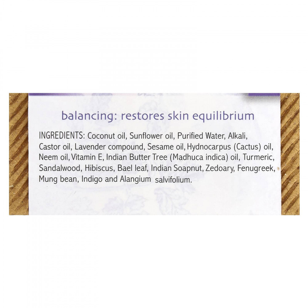 Кокосовое масло, подсолнечное масло, очищенная вода, щелочь, касторовое масло (Rícinus), фитохимические вещества лаванды (Lavandula), масло семян кунжута (Sesamum indicum), чаульмугровое масло (Hydnocarpus), масло нима (Azadirachta indica), витамин E, масло мадуки индийской (Madhuca indica), куркума (Curcuma longa), сандаловое дерево (Pterocarpus santalinus), гибискус (Hibiscus), лист айвы бенгальской (Aegle marmelos), плод индийского мыльного дерева (Sapindus saponaria), цедоария (Curcuma zedoria), пажитник, бобы мунг (Vigna radiata), краситель индиго и алангиум шалфеелистный (Alangium salvifolium)
