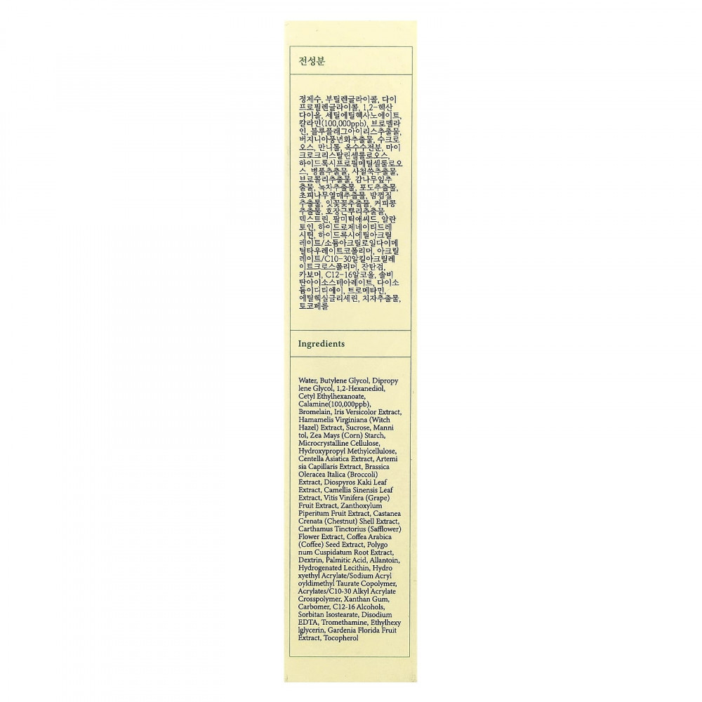 Вода, бутиленгликоль, дипропиленгликоль, 1,2-гександиол, цетилэтилгексаноат, каламин (100 000 част. / млрд), бромелаин, экстракт ириса разноцветного (Iris versicolor), экстракт гамамелиса (Hamamelis virginiana), сахароза, манни тол, кукурузный крахмал (Zea mays), микрокристаллическая целлюлоза, гидроксипропилметилцеллюлоза, экстракт готу колы (Centella asiatica), экстракт полыни (Artemi sia capillaris), экстракт брокколи (Brassica oleracea italica), экстракт листьев диоспироса каки, экстракт листьев зеленого чая (Camellia sinensis), экстракт плодов винограда (Vitis vinifera), экстракт сычуаньского перца (Zanthoxylum piperitum), экстракт скорлупы каштана (castanea crenata), экстракт цветков сафлора (Carthamus tinctorius), экстракт зерен кофе арабики (Coffea arabica), экстракт корня многоцветкового (Polygo num cuspidatum), декстрин, пальмитиновая кислота, аллантоин, гидрогенизированный лецитин, сополимер гидроксиэтилакрилата и натрия акрилоилдиметилтаурата, акрилат/c10-30 алкил акрилат кроссполимер, ксантановая камедь, карбомер, c12-16 спирты, сорбитан изостеарат, двунатриевая ЭДТК, трометамин, этилгексилглицерин, экстракт плодов гардении жасминовидной (Gardenia florida), токоферол.