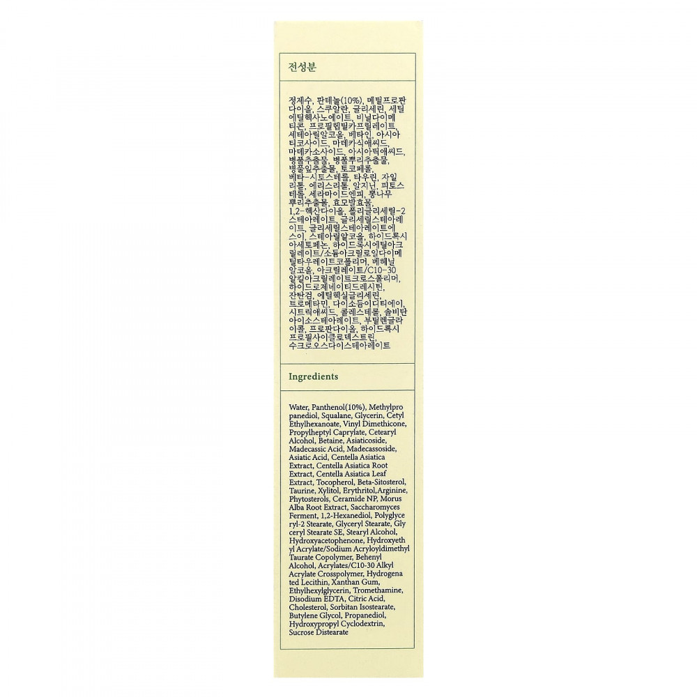 Вода, пантенол (10%), метилпропандиол, сквалан, глицерин, цетилэтилгексаноат, винил диметикон, пропилгептил каприлат, цетеариловый спирт, бетаин, азиатикозид, мадекассовая кислота, мадекассосид, азиатиковая кислота, экстракт готу колы (Centella asiatica), экстракт корня центеллы азиатской, экстракт листьев центеллы азиатской, токоферол, бета-ситостерол, таурин, ксилитол, эритритол, аргинин, фитостеролы, керамид NP, экстракт корня белой шелковицы (Morus alba), сахаромицеты, 1,2-гександиол, полиглицерил-2 стеарат, глицерил стеарат, глицерил стеарат, стеариловый спирт, гидроксиацетофенон, гидроксиэтил акрилат/натрия акрилоилдиметилтаурата сополимер, бегениловый спирт, акрилат/c10-30 алкил акрилат кроссполимер, гидрогенизированный лецитин, ксантановая камедь, этилгексилглицерин, трометамин, двунатриевая ЭДТК, лимонная кислота, холестерина, сорбитан изостеарат, бутиленгликоль, пропандиол, гидроксипропил циклодекстрин, дистеарат сахарозы.