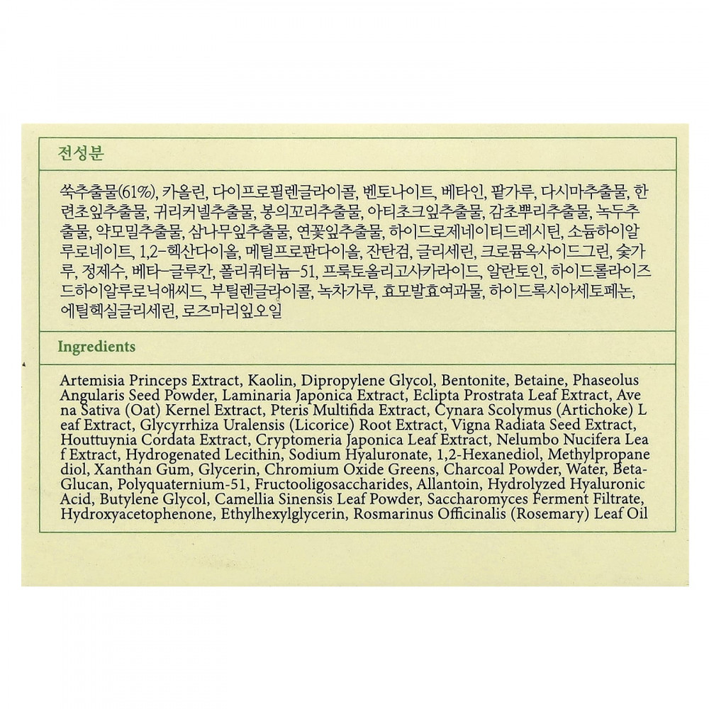 Экстракт полыни принцепса, каолин, дипропиленгликоль, бентонит, бетаин, порошок из семян Phaseolus angularis, экстракт ламинарии японской (Laminaria japonica), экстракт листьев эклипты простертой (Eclipta prostrata), экстракт ядер овса (Avena sativa), экстракт pteris multifida, экстракт листьев артишока (Cynara scolymus), экстракт корня солодки уральской (Glycyrrhiza uralensis), экстракт семян маша (Vigna radiata), экстракт хауттюйнии (Houttuynia cordata), экстракт листьев криптомерии японской, экстракт листьев Nelumbo nucifera, гидрогенизированный лецитин, гиалуронат натрия, 1,2-гександиол, метилпропандиол, ксантановая камедь, глицерин, хромовая зелень, порошок из древесного угля, вода, бета-глюкан, поликватерниум-51, фруктоолигосахариды, аллантоин, гидролизованная гиалуроновая кислота, бутиленгликоль, порошок из листьев камелии китайской, продукт ферментации дрожжевых грибков-сахаромицетов, гидроксиацетофенон, этилгексилглицерин, масло из листьев розмарина (Rosmarinus officinalis).