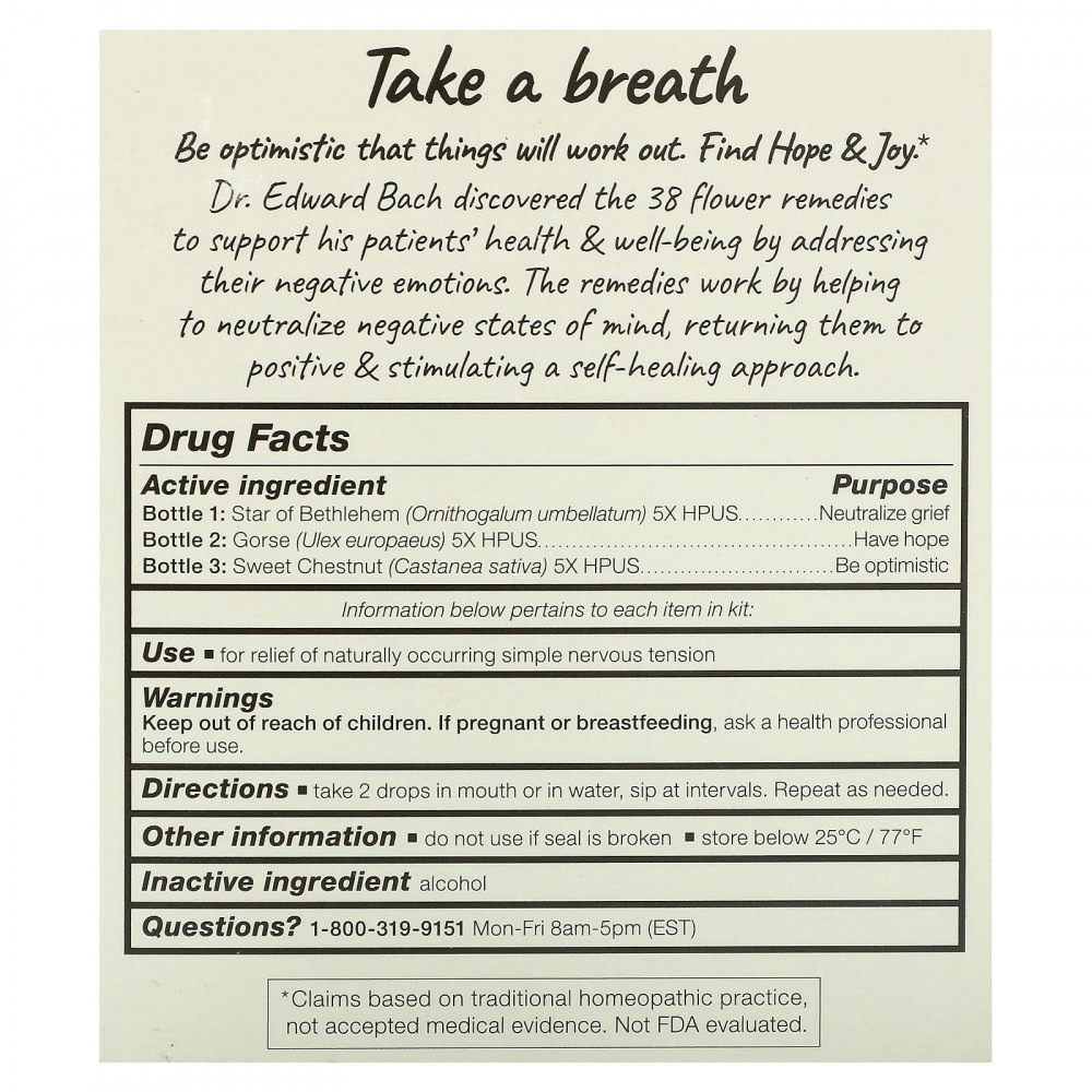 | Бутылка 1: Вифлеемская звезда (Ornithogalum umbellatum) 5X HPUS Бутылка 2: Дрок (Ulex europaeus) 5X HPUS Бутылка 3: Каштан сладкий (Castanea sativa) 5X HPUS | Нейтрализовать горе Есть надежда Будьте оптимистами |