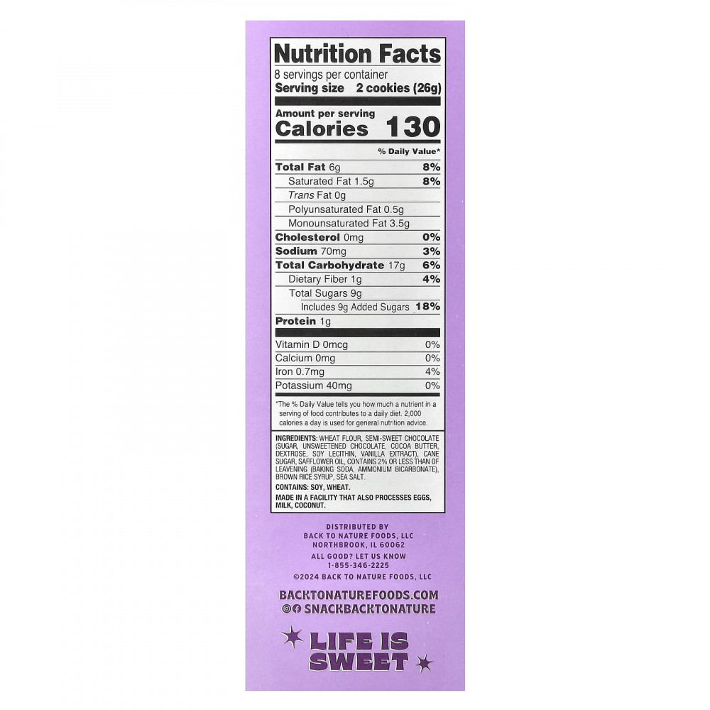 Пшеничная мука, полусладкий шоколад с сахаром, горький шоколад, какао-масло, декстроза, соевый лецитин, экстракт ванили), тростниковый сахар, сафлоровое масло, содержит не более 2% разрыхлителей (пищевая сода, бикарбонат аммония), сироп из бурого риса, морская соль.