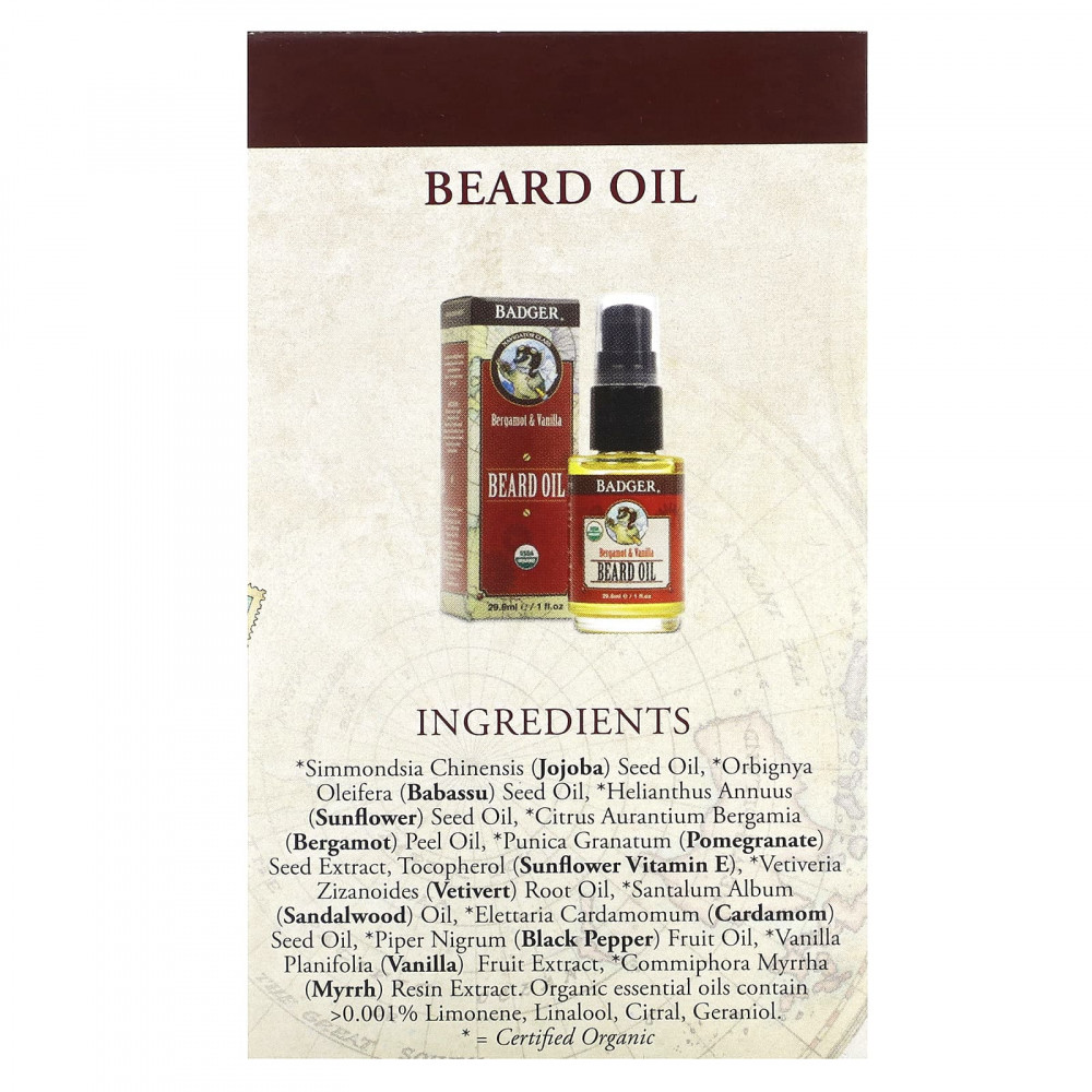 Масло для бороды: масло семян жожоба (Simmondsia chinensis)*, масло из семян бабассу (Orbignya oleifera)*, подсолнечное масло (Helianthus annuus)*, масло из цедры плодов бергамота (Aurantium bergamia)*, экстракт косточек граната (Punica granatum)*, токоферол (витамин Е из подсолнечника), масло из корня ветивера (Vetiveria zizanoides)*, масло сандалового дерева (Santalum album)*, масло из семян кардамона (Elettaria cardamomum)*, масло из плодов перца черного (Piper nigrum)*, экстракт ванили (Vanilla planifolia)*, экстракт мирры (Commiphora myrrha)*. Органические эфирные масла содержат > 0,001% лимонена, линалоол, цитраль, гераниол.