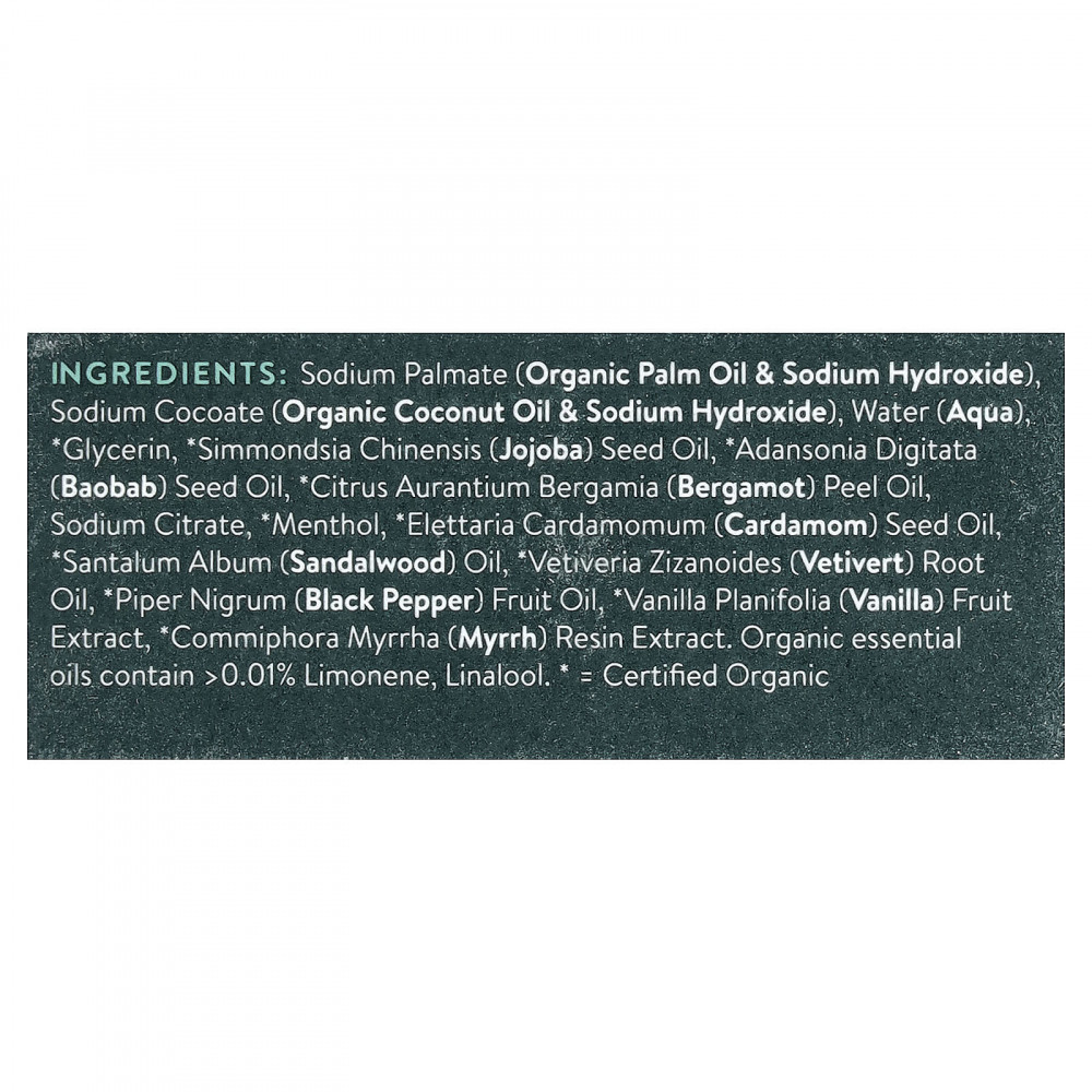 Пальмат натрия (органическое пальмовое масло и гидроксид натрия), кокоат натрия (органическое кокосовое масло и гидроксид натрия), вода (Aqua), глицерин, масло семян жожоба (Simmondsia chinensis)*, масло из семян баобаба (Adansonia digitata)*, масло из цедры бергамота (Citrus aurantium bergamia)*, цитрат натрия, * ментол, масло из семян кардамона (Elettaria cardamomum)*, масло сандалового дерева (Santalum album), масло из корня ветивера (Vetiveria zizanoides)*, масло из плодов перца черного (Piper nigrum)*, экстракт ванили (Vanilla planifolia)*, экстракт смолы мирры (Commiphora myrrha)*. органические эфирные масла содержат > 0,01% лимонена, линалоола.
