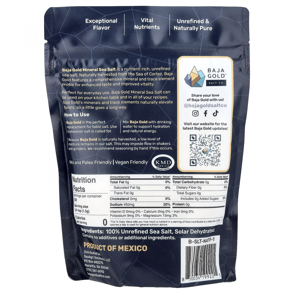 Минеральная морская соль Baja Gold - это богатая питательными веществами нерафинированная морская соль. Натурально собранный в море Кортеса, Baja Gold обладает комплексным составом минералов и микроэлементов для улучшения вкуса и повышения жизненной силы.